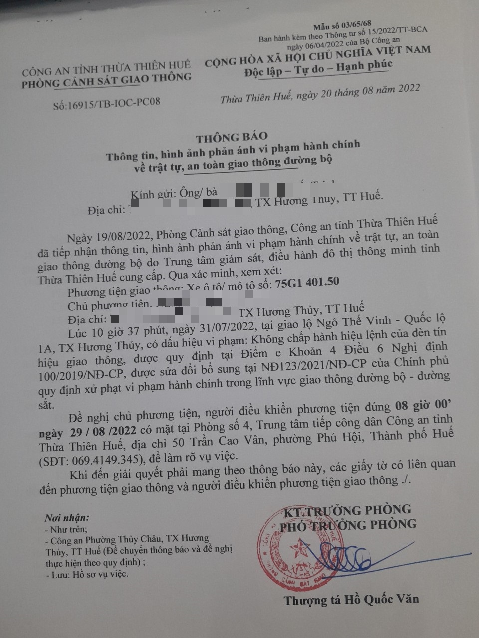 Vào lúc 10 giờ 37 phút, ngày 31/07/2022 Xe máy mang biển kiểm soát 75G140150 Không chấp hành hiệu lệnh của đèn tín hiệu giao thông tại địa điểm Ngô Thế Vinh - QL1A