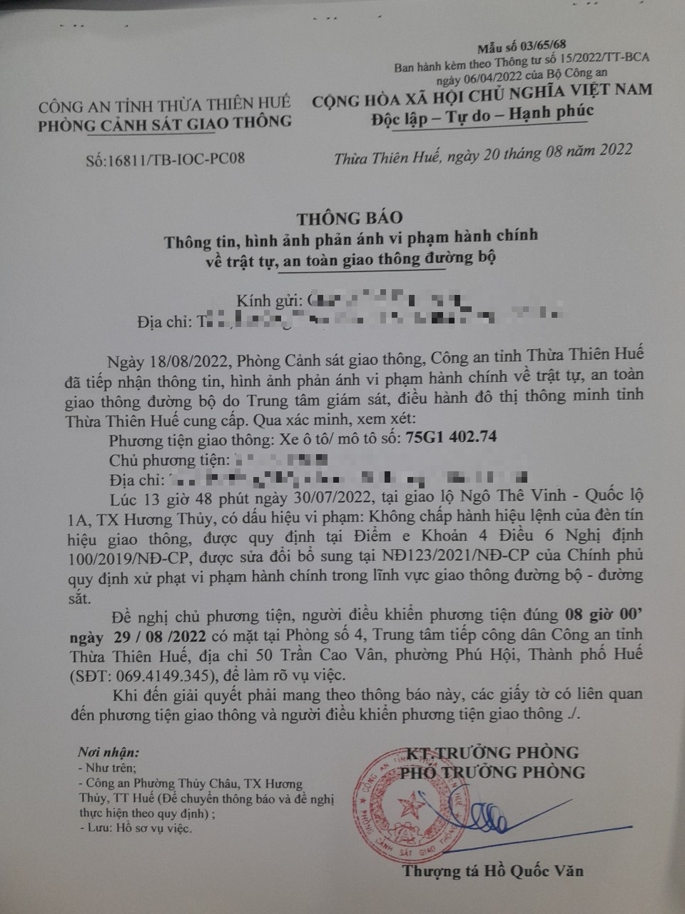 Vào lúc 13 giờ 48 phút ngày 30/07/2022, mô tô mang biển kiểm soát 75G140274 không chấp hành hiệu lệnh của đèn tín hiệu giao thông tại giao lộ Quốc Lộ 1A - Ngô Thế Vinh.
