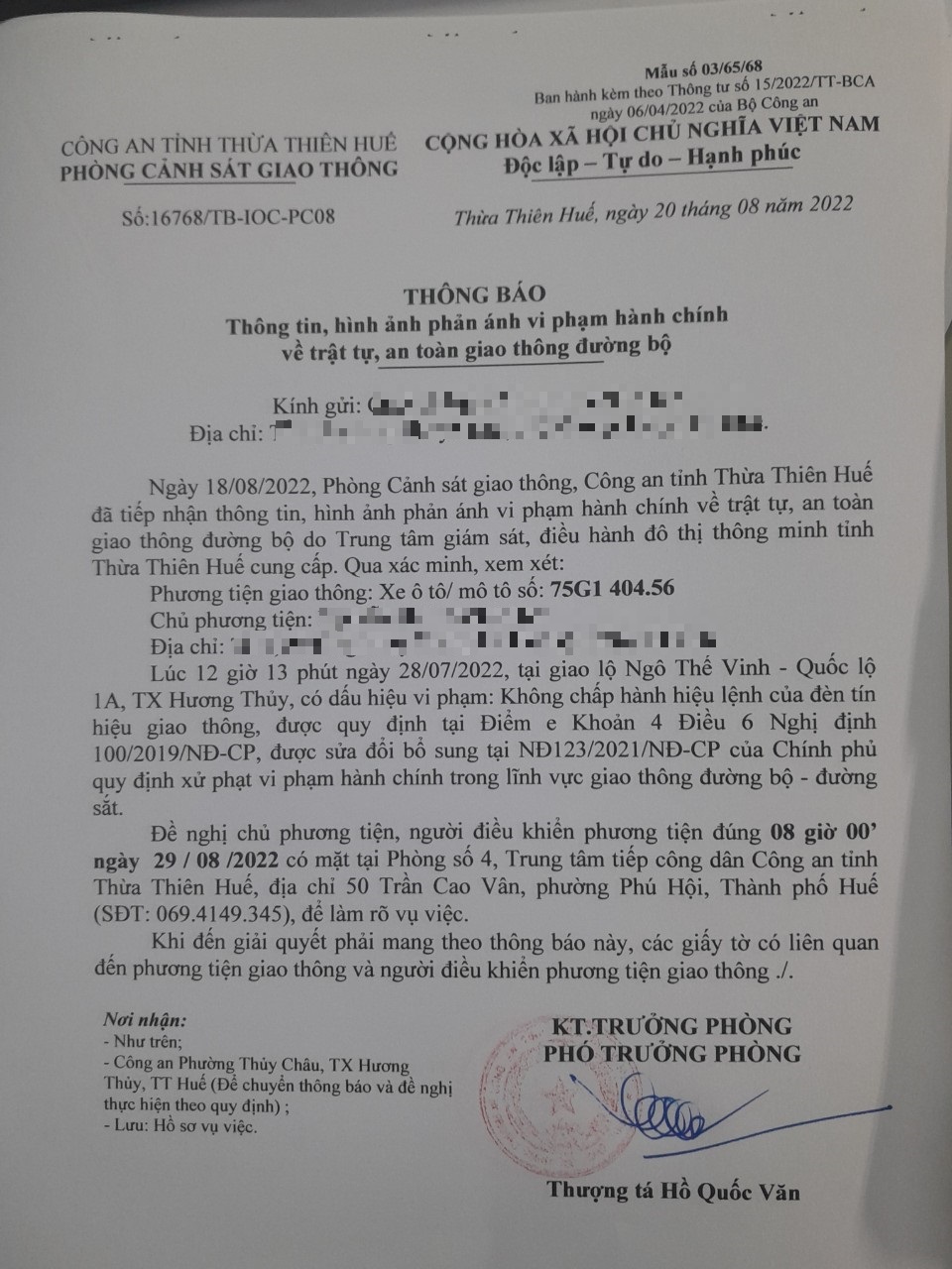Vào lúc 12 giờ 13 phút ngày 28/07/2022, mô tô mang biển kiểm soát 75G140456 không chấp hành hiệu lệnh của đèn tín hiệu giao thông tại giao lộ Quốc Lộ 1A - Ngô Thế Vinh.
