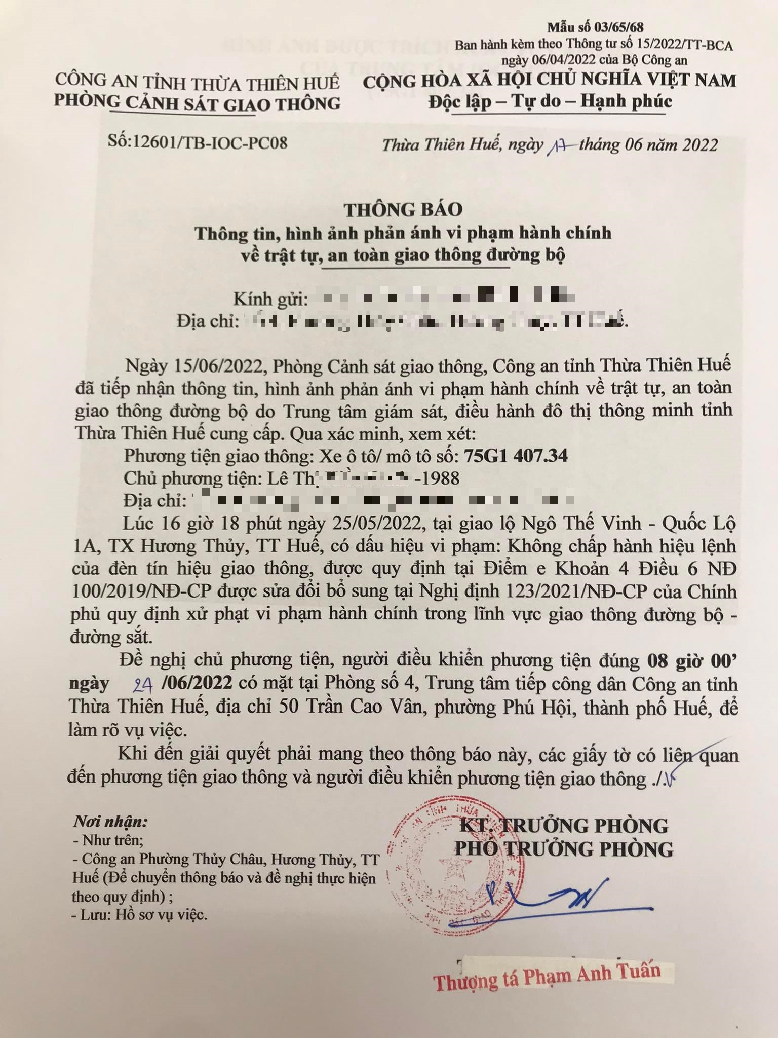 Vào lúc 16 giờ 18 phút ngày 25/05/2022, mô tô mang biển kiểm soát 75G140734 không chấp hành hiệu lệnh của đèn tín hiệu giao thông tại giao lộ Quốc Lộ 1A - Ngô Thế Vinh.