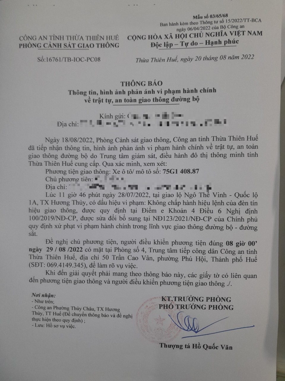 Vào lúc 11 giờ 46 phút ngày 28/07/2022, mô tô mang biển kiểm soát 75G140887 không chấp hành hiệu lệnh của đèn tín hiệu giao thông tại giao lộ Quốc Lộ 1A - Ngô Thế Vinh.