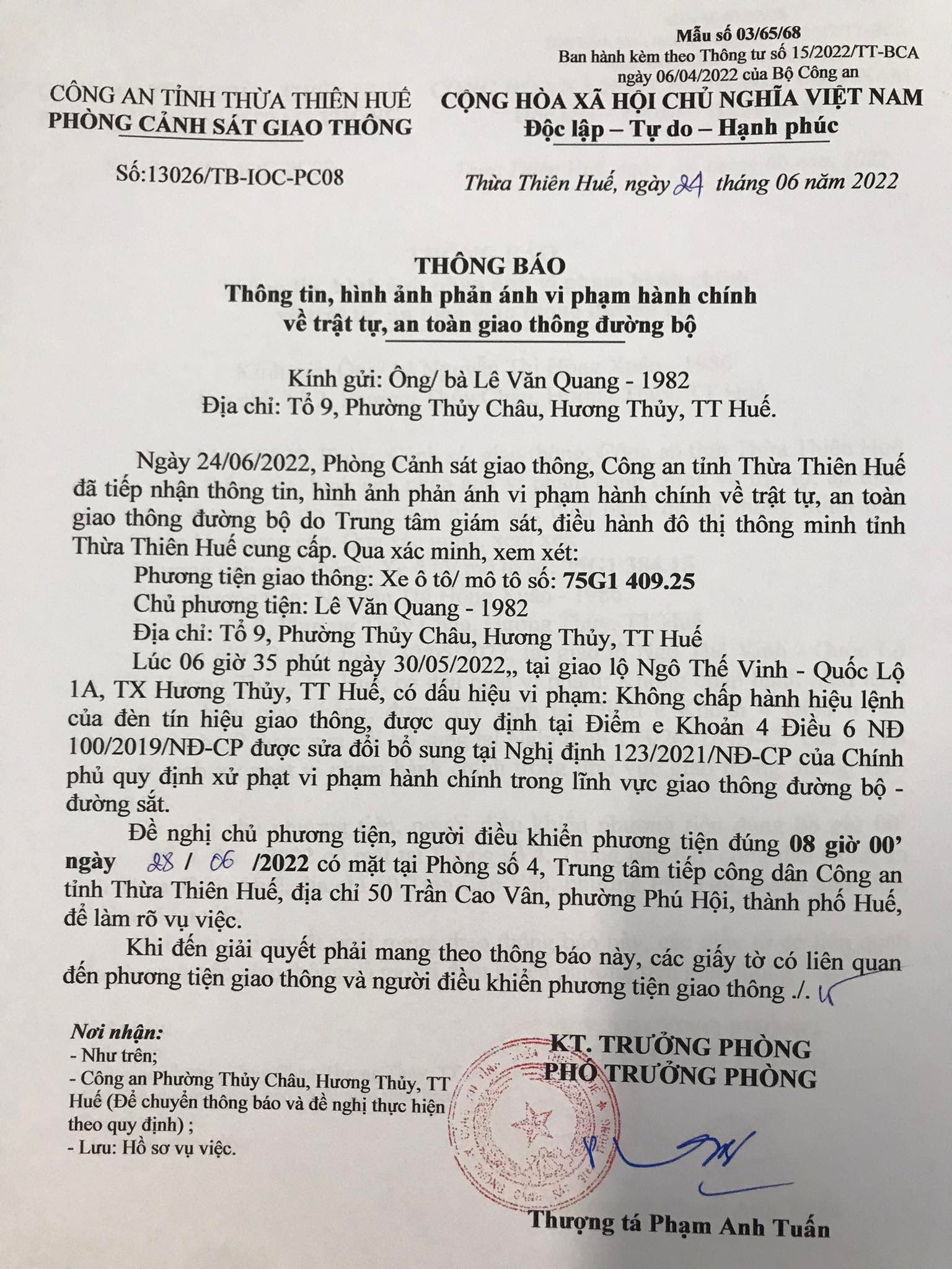 Phòng Cảnh sát giao thông đã lập hồ sơ, thông báo chủ phương tiện đến làm việc vào ngày 28/6/2021. Tuy nhiên, hiện chủ phương tiện vẫn chưa trình diện tại cơ quan. Phòng Cảnh sát giao thông sẽ tiếp tục gửi thông báo đến Công an địa phương nơi chủ phương tiện thường trú, đồng thời thông báo lực lượng tuần tra kiểm soát trên địa bàn, trong quá trình làm nhiệm vụ phát hiện, xử lý.