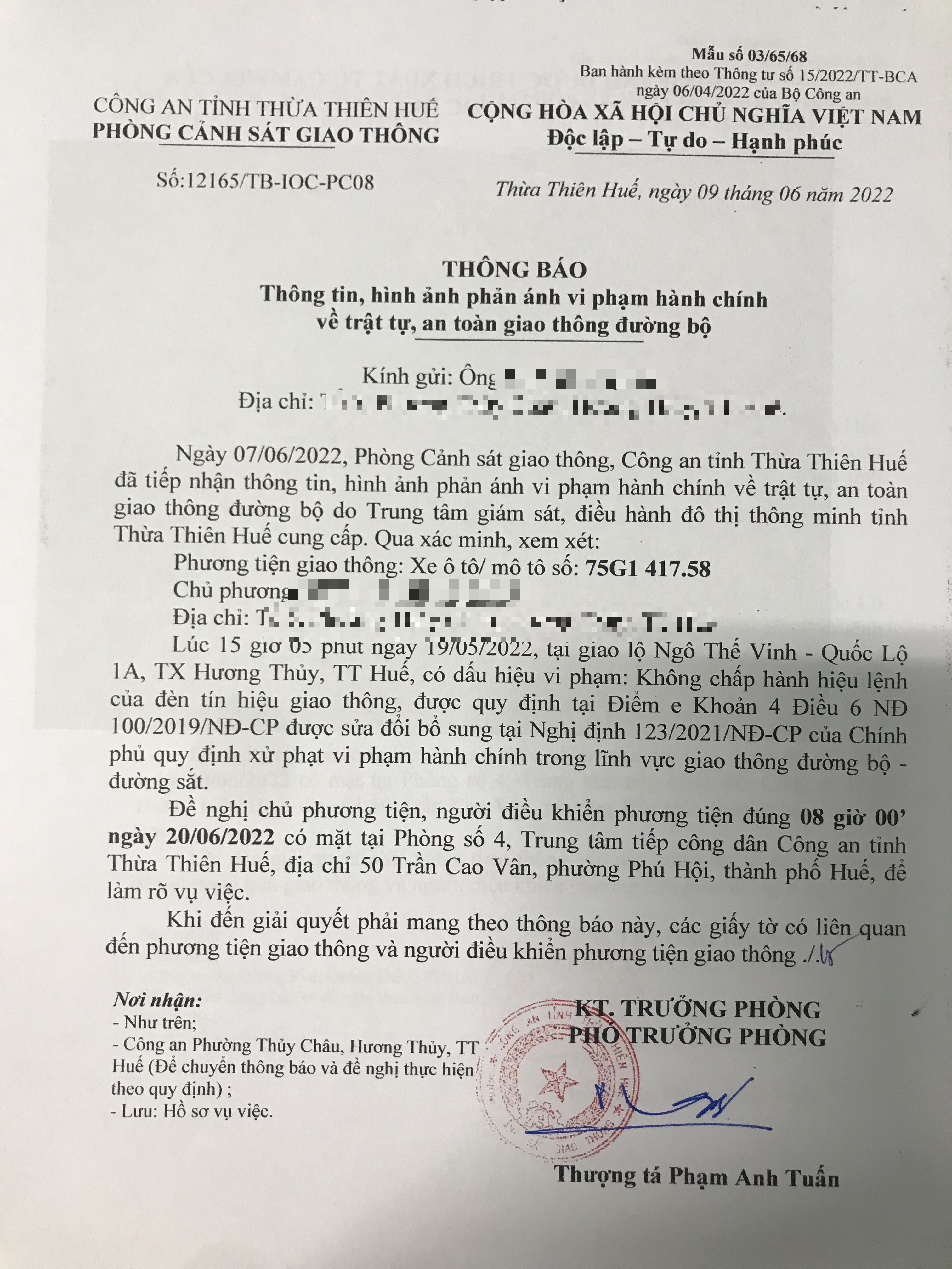 Vào lúc 15 giờ 05 phút ngày 19/05/2022, mô tô mang biển kiểm soát 75G141758 không chấp hành hiệu lệnh của đèn tín hiệu giao thông tại giao lộ Quốc Lộ 1A - Ngô Thế Vinh.