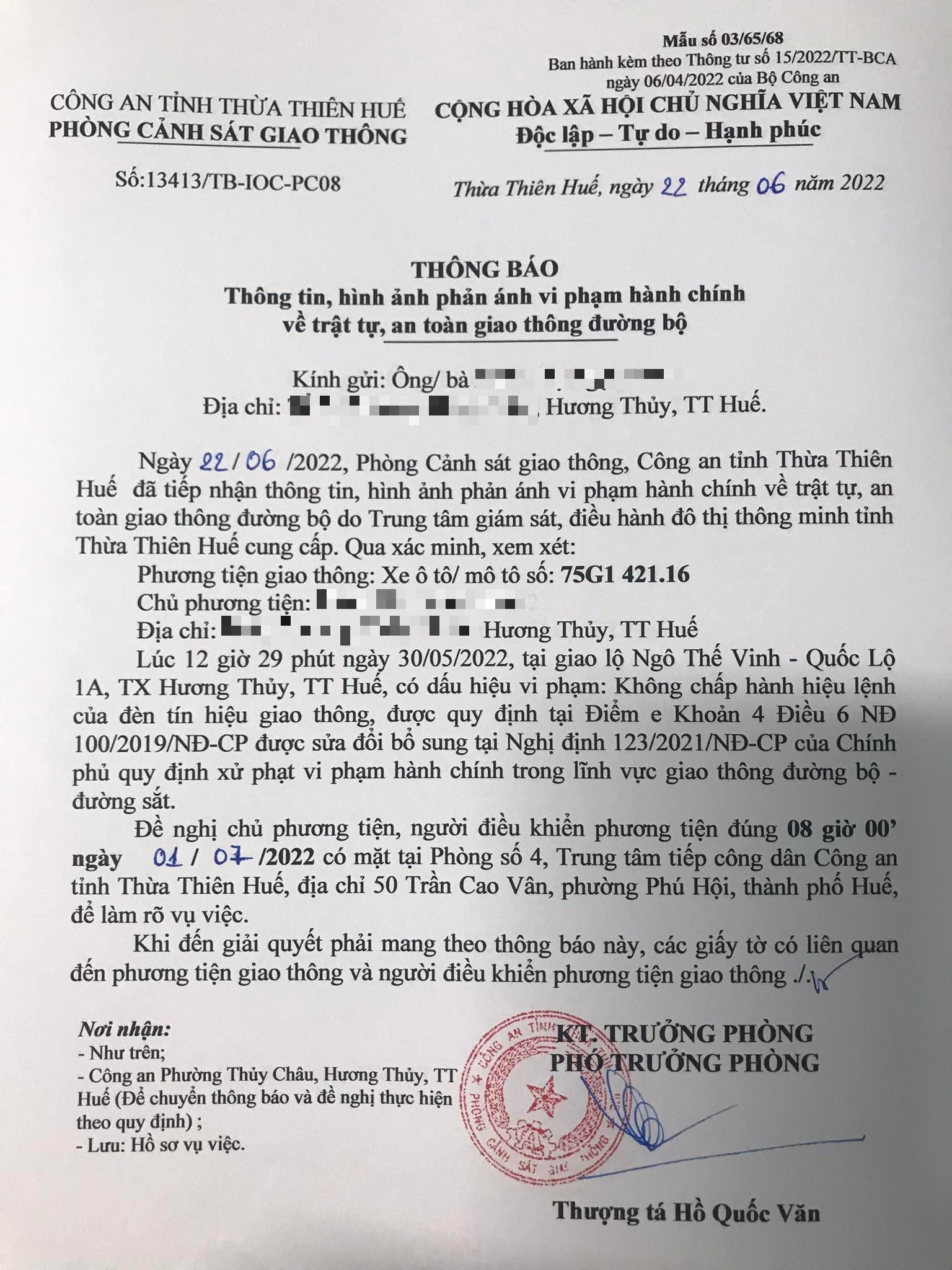 Phòng Cảnh sát giao thông đã gửi thông báo, yêu cầu chủ phương tiện đến làm việc vào ngày 01/7/2022. Tuy nhiên, hiện chủ phương tiện vẫn chưa trình diện tại cơ quan.Phòng Cảnh sát giao thông sẽ tiếp tục thông báo Công an địa phương nơi chủ phương tiện thường trú; đồng thời, thông báo các tổ tuần tra kiểm soát trên địa bàn, trong quá trình làm nhiệm vụ nếu phát hiện sẽ tiến hành dừng xe để xử lý.