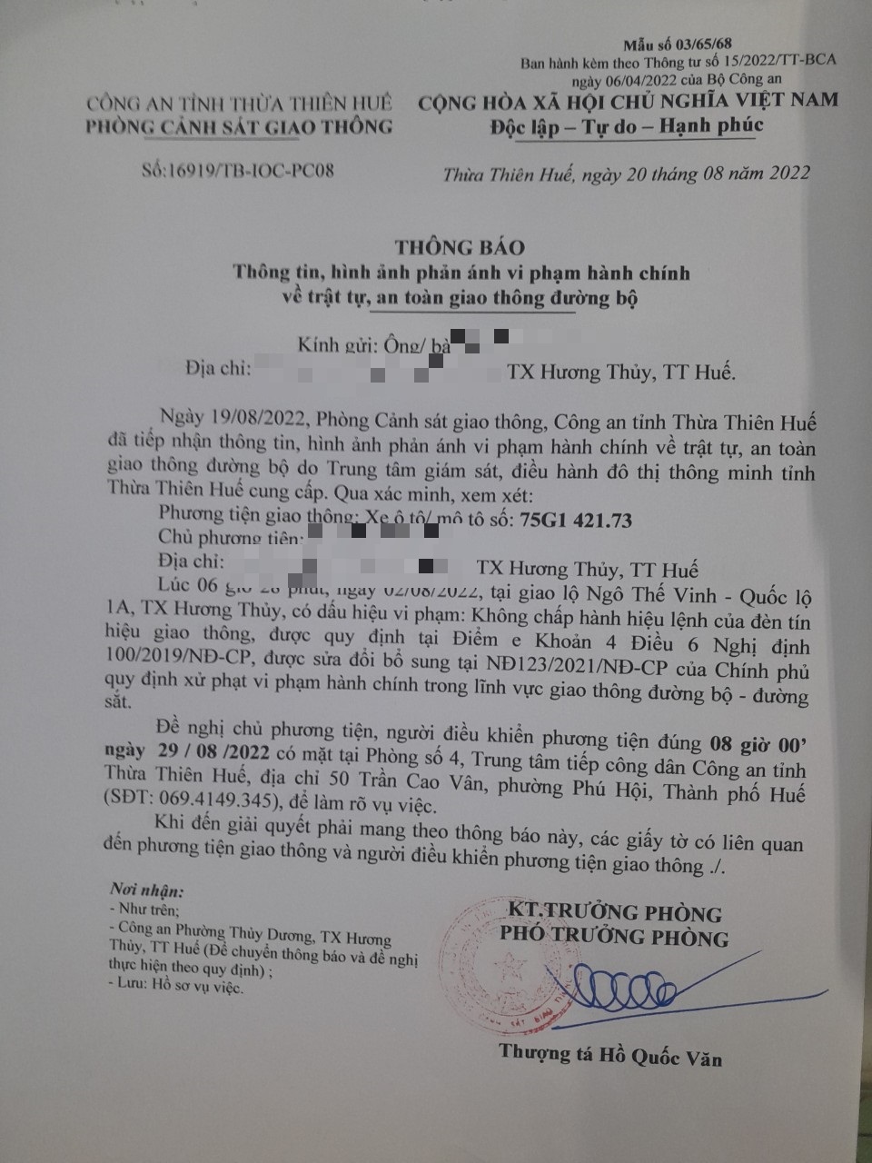 Vào lúc 06 giờ 28 phút, ngày 02/08/2022 Xe máy mang biển kiểm soát 75G142173 Không chấp hành hiệu lệnh của đèn tín hiệu giao thông tại địa điểm Ngô Thế Vinh - QL1A.