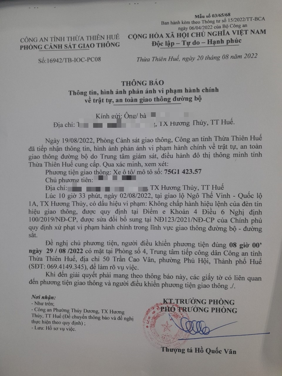 Vào lúc 10 giờ 33 phút, ngày 02/08/2022 Xe máy mang biển kiểm soát 75G142357 Không chấp hành hiệu lệnh của đèn tín hiệu giao thông tại địa điểm Ngô Thế Vinh - QL1A.