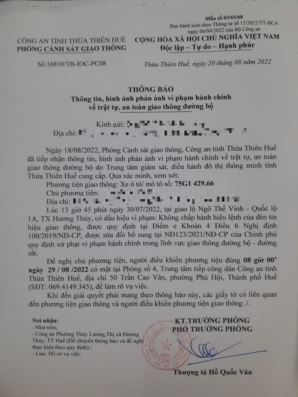 Vào lúc 13 giờ 45 phút ngày 30/07/2022, mô tô mang biển kiểm soát 75G142966 không chấp hành hiệu lệnh của đèn tín hiệu giao thông tại giao lộ Quốc Lộ 1A - Ngô Thế Vinh.