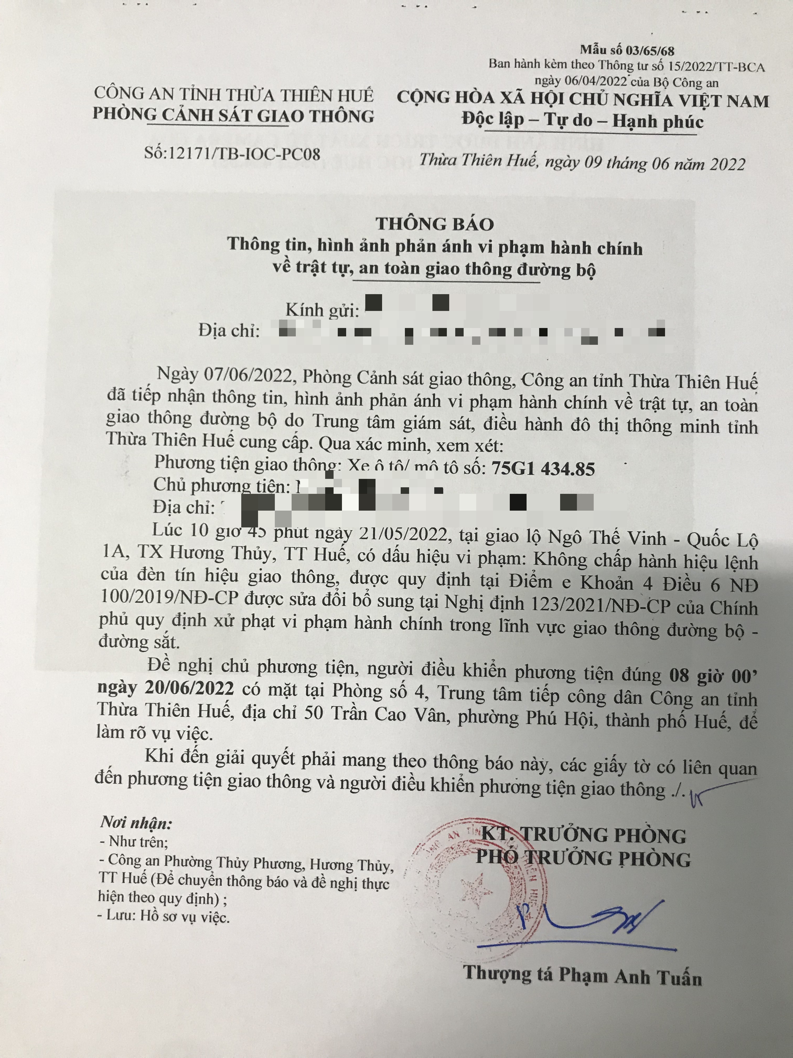 Vào lúc 10 giờ 45 phút ngày 21/05/2022, mô tô mang biển kiểm soát 75G143485 không chấp hành hiệu lệnh của đèn tín hiệu giao thông tại giao lộ Quốc Lộ 1A - Ngô Thế Vinh.
