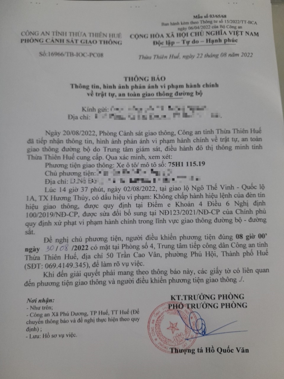 Vào lúc 14 giờ 37 phút, ngày 02/08/2022 Xe máy mang biển kiểm soát 75H111519 Không chấp hành hiệu lệnh của đèn tín hiệu giao thông tại địa điểm Ngô Thế Vinh - QL1A.
