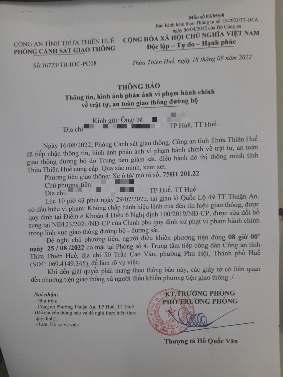Vào lúc 10 giờ 43 phút ngày 29/07/2022, mô tô mang biển kiểm soát 75H120122 không chấp hành hiệu lệnh của đèn tín hiệu giao thông tại giao lộ Quốc Lộ 49 TT Thuận An.