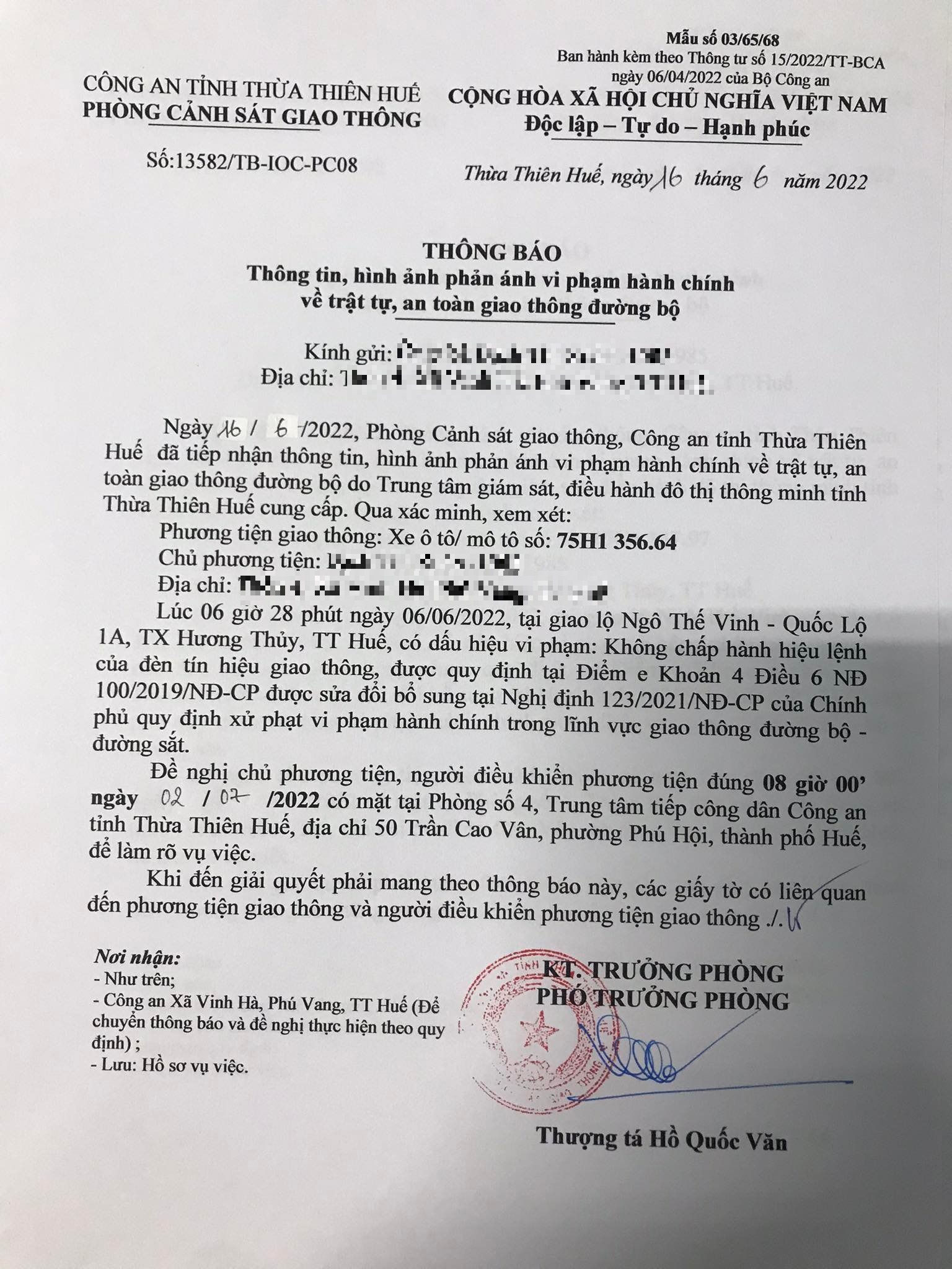 Vào lúc 06 giờ 28 phút ngày 06/06/2022, mô tô mang biển kiểm soát 75H135664 không chấp hành hiệu lệnh của đèn tín hiệu giao thông tại giao lộ Quốc Lộ 1A - Ngô Thế Vinh.
