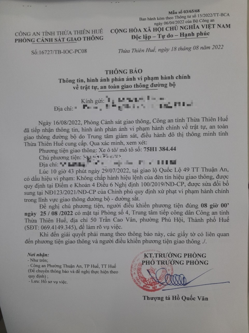 Vào lúc 10 giờ 43 phút ngày 29/07/2022, mô tô mang biển kiểm soát 75H138444 không chấp hành hiệu lệnh của đèn tín hiệu giao thông tại giao lộ Quốc Lộ 49 TT Thuận An.