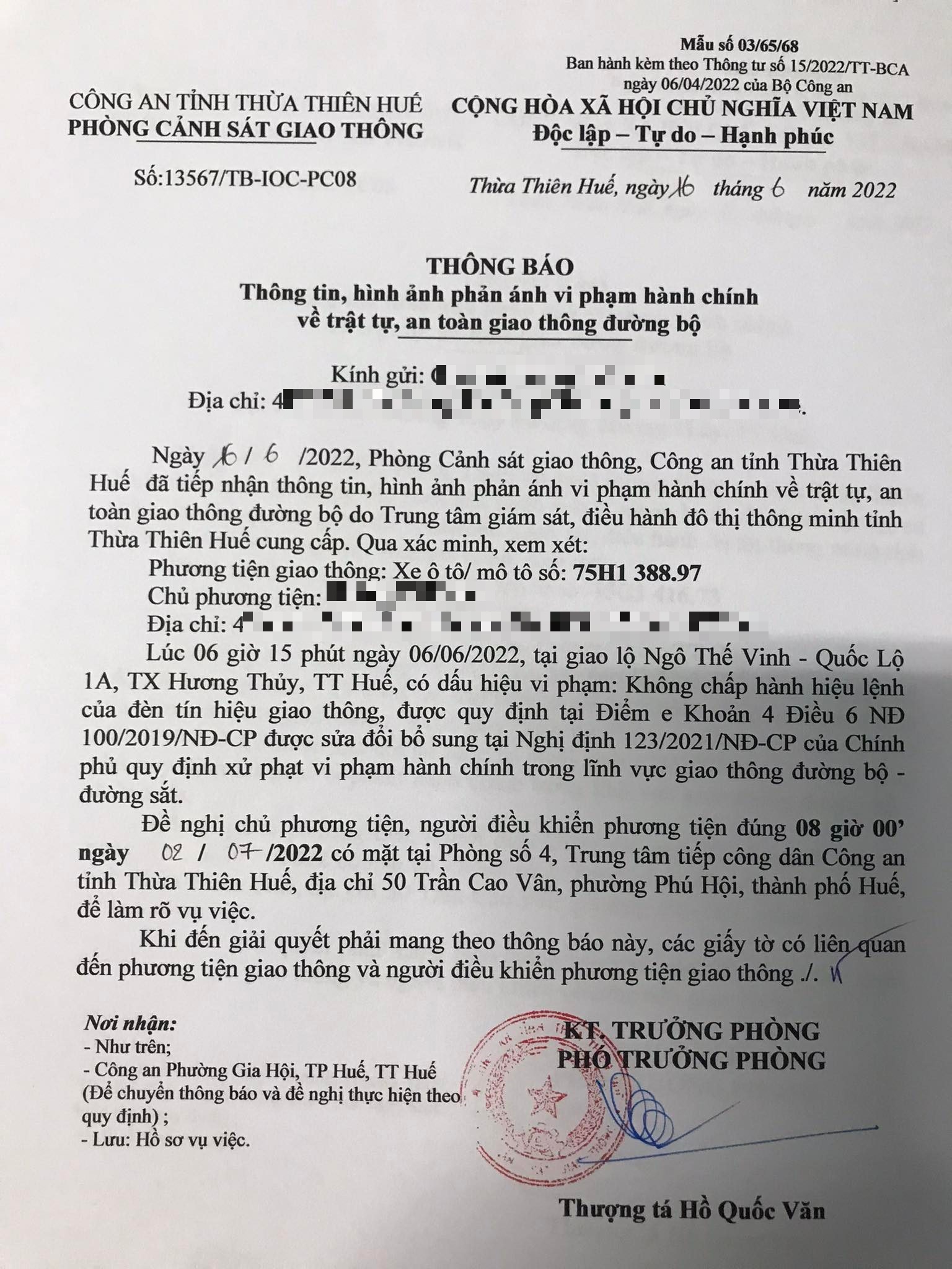 Vào lúc 06 giờ 15 phút ngày 06/06/2022, mô tô mang biển kiểm soát 75H138897 không chấp hành hiệu lệnh của đèn tín hiệu giao thông tại giao lộ Quốc Lộ 1A - Ngô Thế Vinh.