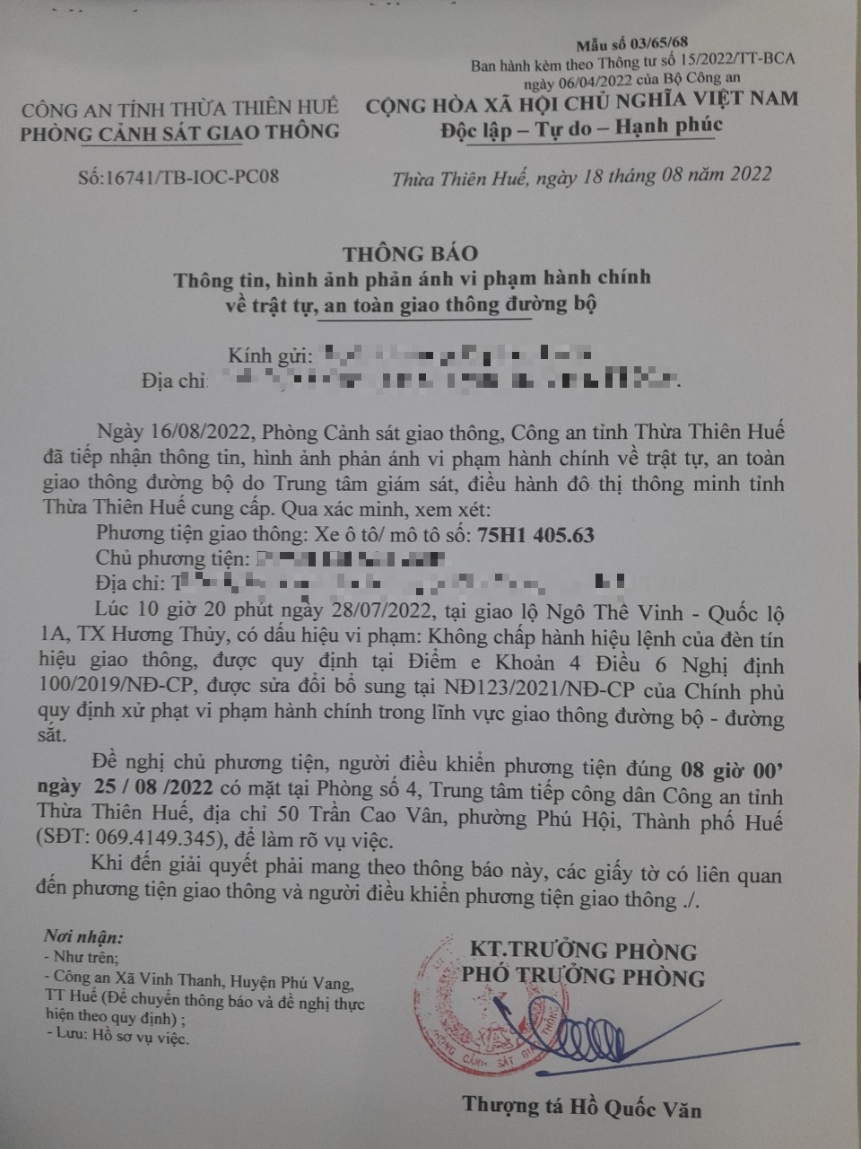 Vào lúc 10 giờ 20 phút ngày 28/07/2022, mô tô mang biển kiểm soát 75H140563 không chấp hành hiệu lệnh của đèn tín hiệu giao thông tại giao lộ Quốc Lộ 1A - Ngô Thế Vinh.