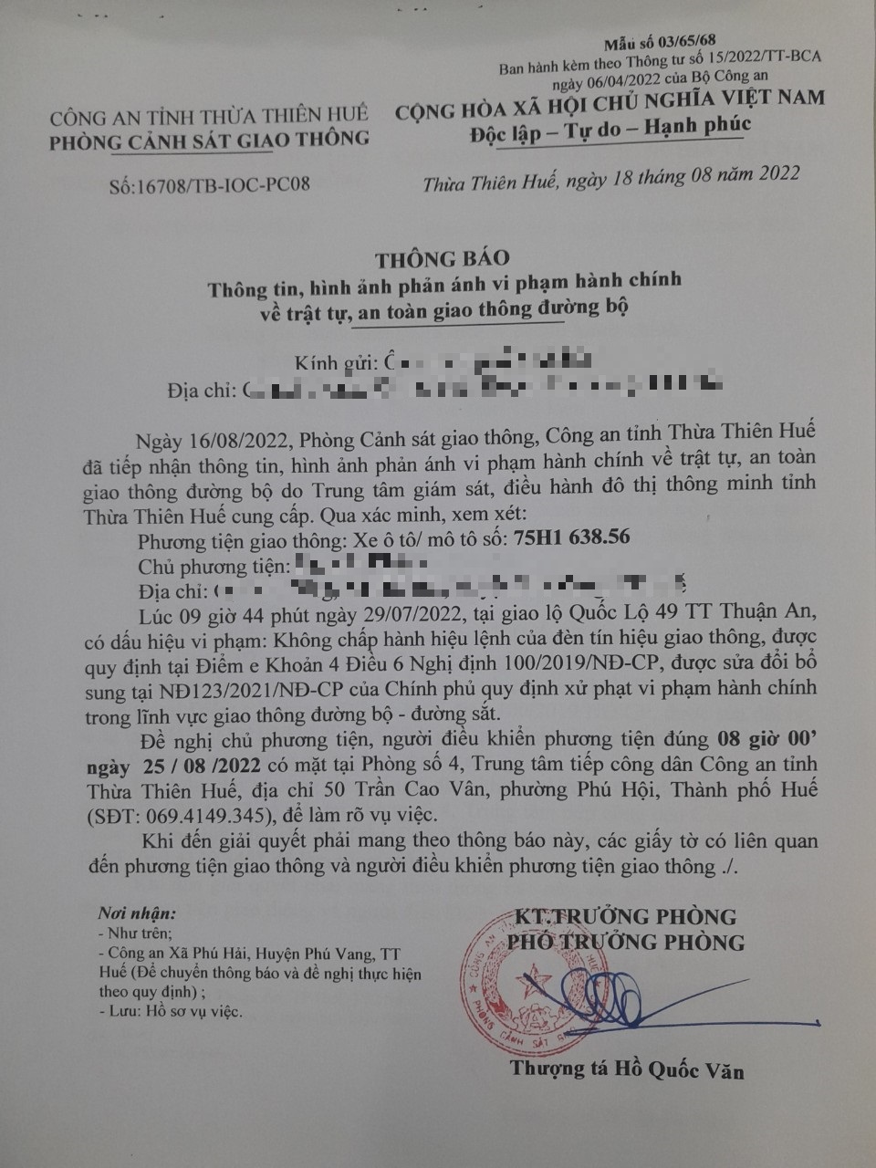 Vào lúc 09 giờ 44 phút ngày 29/07/2022, mô tô mang biển kiểm soát 75H163856 không chấp hành hiệu lệnh của đèn tín hiệu giao thông tại giao lộ Quốc Lộ 49 TT Thuận An.