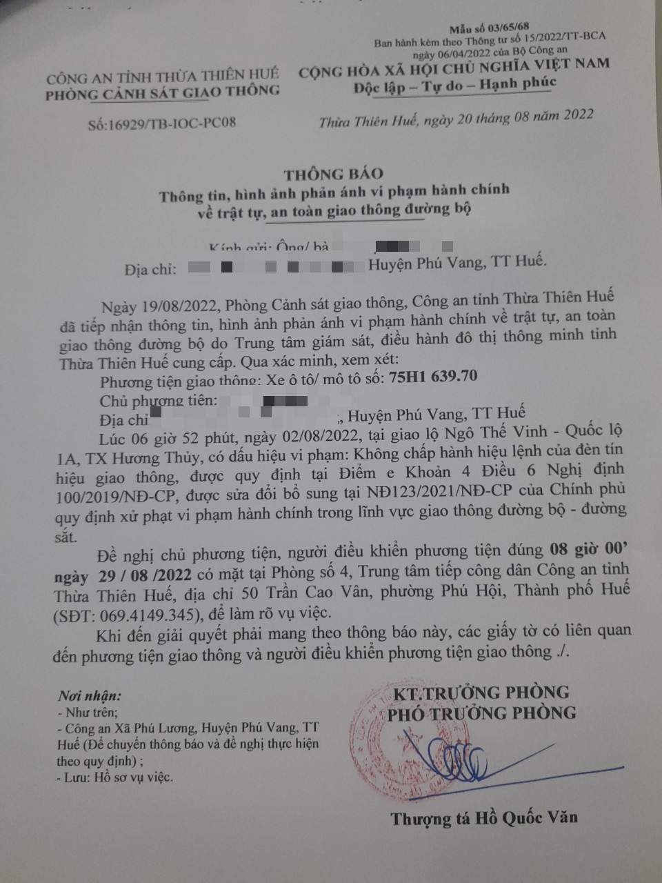 Vào lúc 06 giờ 52 phút, ngày 02/08/2022 Xe máy mang biển kiểm soát 75H163970 Không chấp hành hiệu lệnh của đèn tín hiệu giao thông tại địa điểm Ngô Thế Vinh - QL1A.