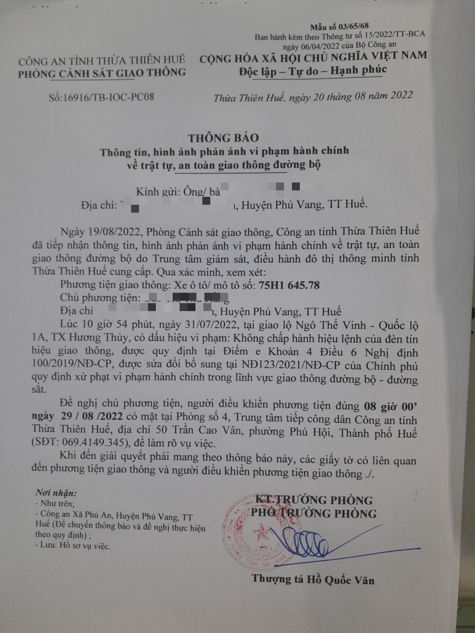 Vào lúc 10 giờ 54 phút, ngày 31/07/2022 Xe máy mang biển kiểm soát 75H164578 Không chấp hành hiệu lệnh của đèn tín hiệu giao thông tại địa điểm Ngô Thế Vinh - QL1A