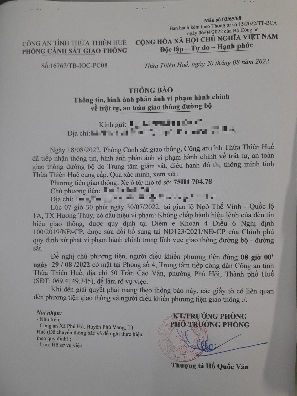 Vào lúc 07 giờ 30 phút ngày 30/07/2022, mô tô mang biển kiểm soát 75H170478 không chấp hành hiệu lệnh của đèn tín hiệu giao thông tại giao lộ Quốc Lộ 1A - Ngô Thế Vinh.