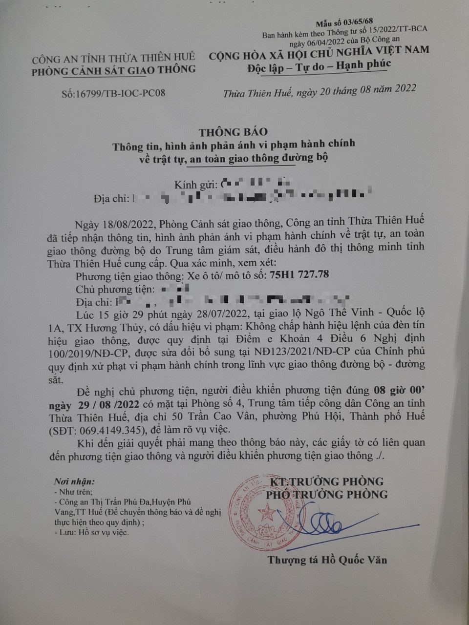 Vào lúc 15 giờ 29 phút ngày 28/07/2022, mô tô mang biển kiểm soát 75H172778 không chấp hành hiệu lệnh của đèn tín hiệu giao thông tại giao lộ Quốc Lộ 1A - Ngô Thế Vinh.