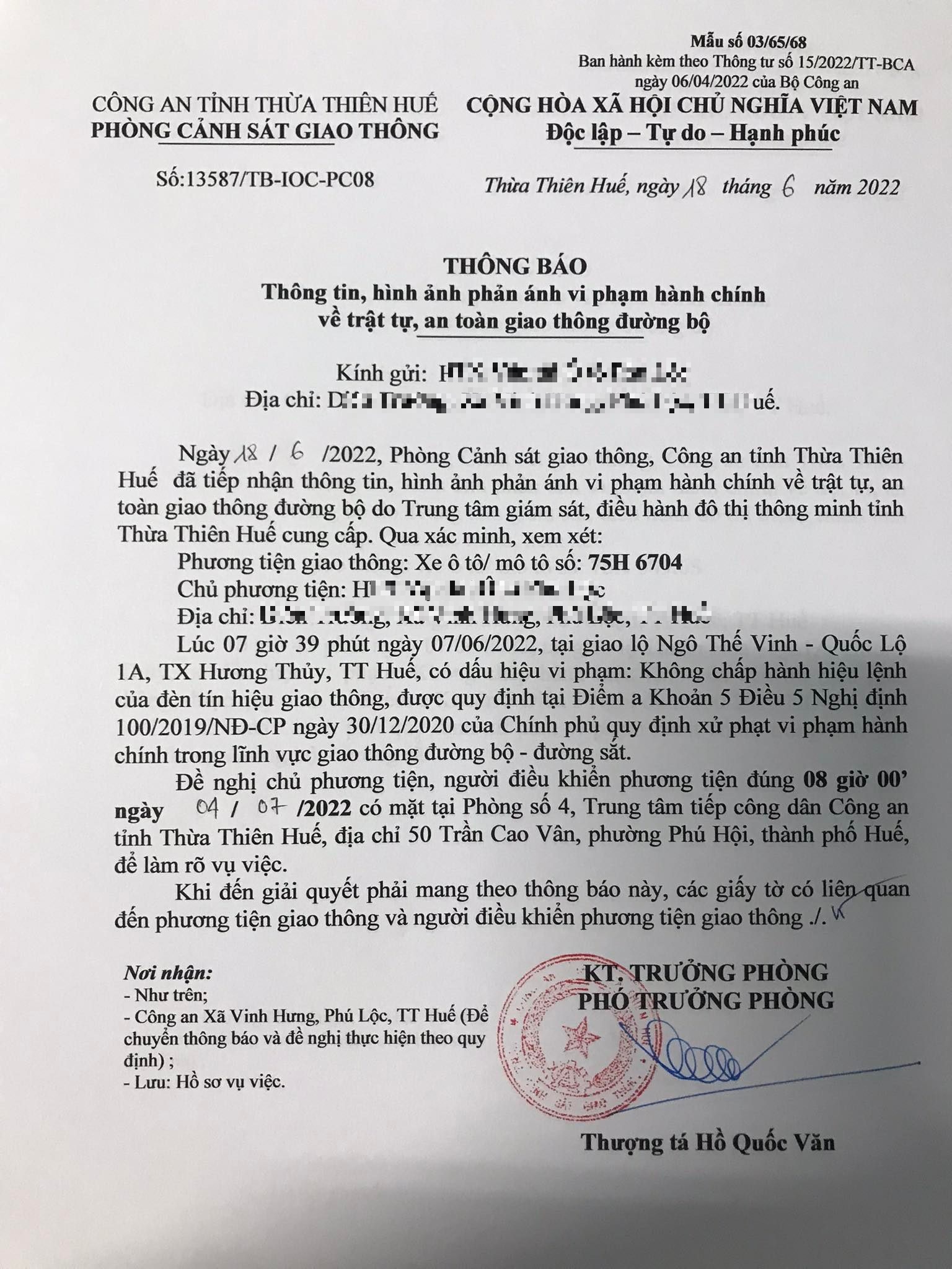 Phòng Cảnh sát giao thông xác định lỗi vi phạm của người điều khiển phương tiện 75H6704 như sau: Không chấp hành hiệu lệnh của đèn tín hiệu giao thông, quy định tại điểm a, khoản 5, điều 5 Nghị định 100/2019/NĐ-CP được sửa đổi, bổ sung tại Nghị định 123/NĐ-CP ngày 28/12/2021.