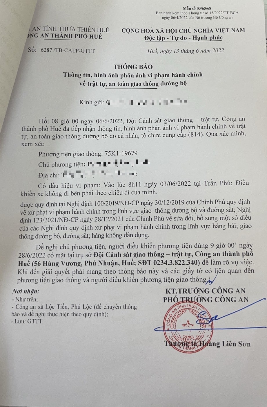 Công an thành phố đã lập hồ sơ, thông báo chủ phương tiện đến làm việc vào ngày 28/6/2022. Tuy nhiên, hiện chủ phương tiện vẫn chưa trình diện tại cơ quan. Công an thành phố Huế sẽ tiếp tục thông báo lực lượng tuần tra trên địa bàn, trong quá trình làm nhiệm vụ phát hiện, xử lý.
