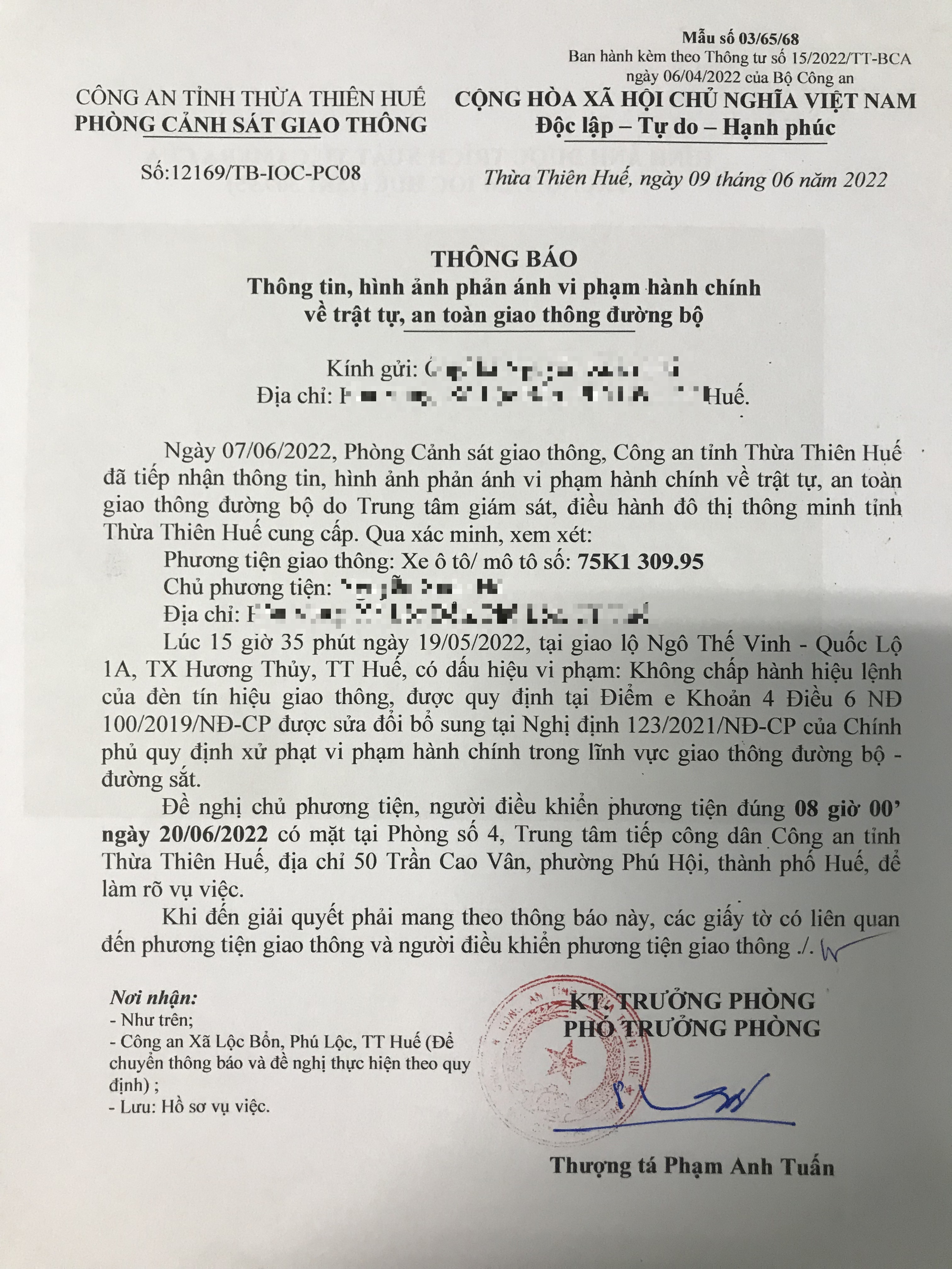 Vào lúc 15 giờ 35 phút ngày 19/05/2022, mô tô mang biển kiểm soát 75K130995 không chấp hành hiệu lệnh của đèn tín hiệu giao thông tại giao lộ Quốc Lộ 1A - Ngô Thế Vinh.