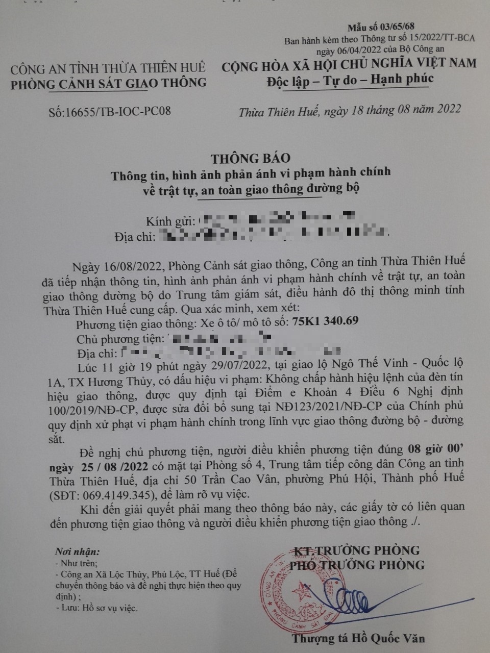 Vào lúc 07 giờ 26 phút ngày 28/07/2022, mô tô mang biển kiểm soát 75K134069 không chấp hành hiệu lệnh của đèn tín hiệu giao thông tại giao lộ Quốc Lộ 1A - Ngô Thế Vinh.