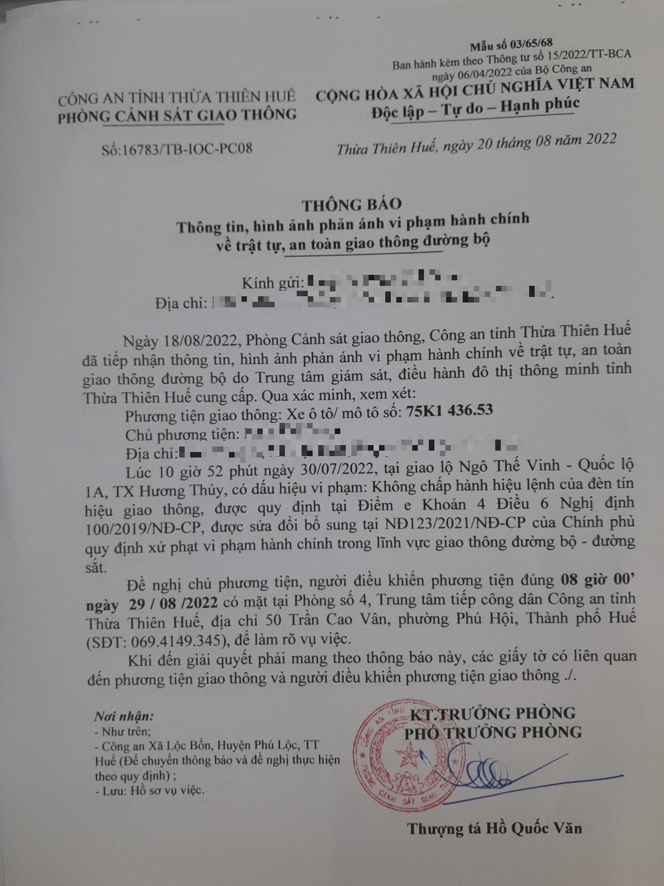 Vào lúc 10 giờ 52 phút ngày 30/07/2022, mô tô mang biển kiểm soát 75K143653 không chấp hành hiệu lệnh của đèn tín hiệu giao thông tại giao lộ Quốc Lộ 1A - Ngô Thế Vinh.