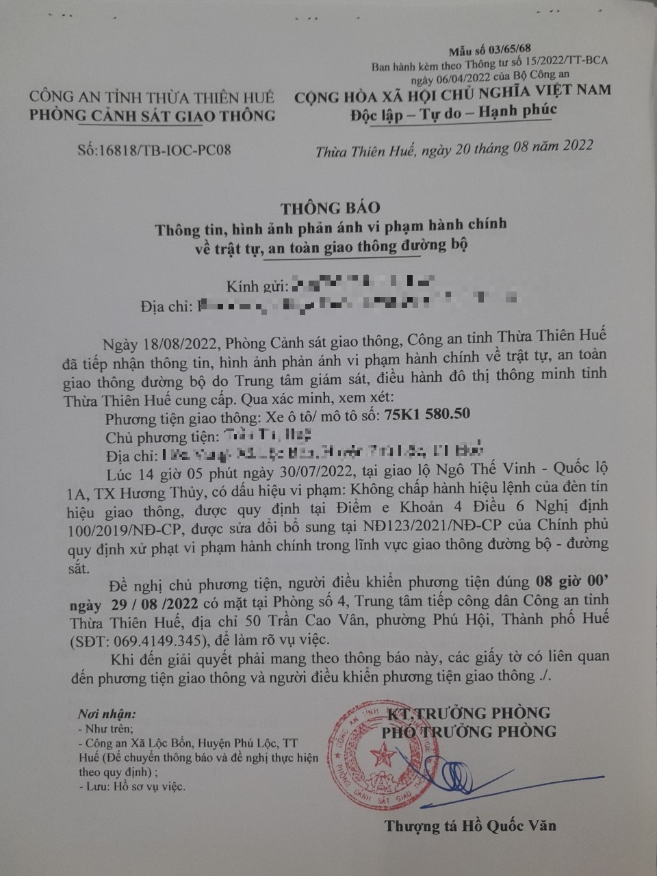Vào lúc 14 giờ 05 phút ngày 30/07/2022, mô tô mang biển kiểm soát 75K158050 không chấp hành hiệu lệnh của đèn tín hiệu giao thông tại giao lộ Quốc Lộ 1A - Ngô Thế Vinh.