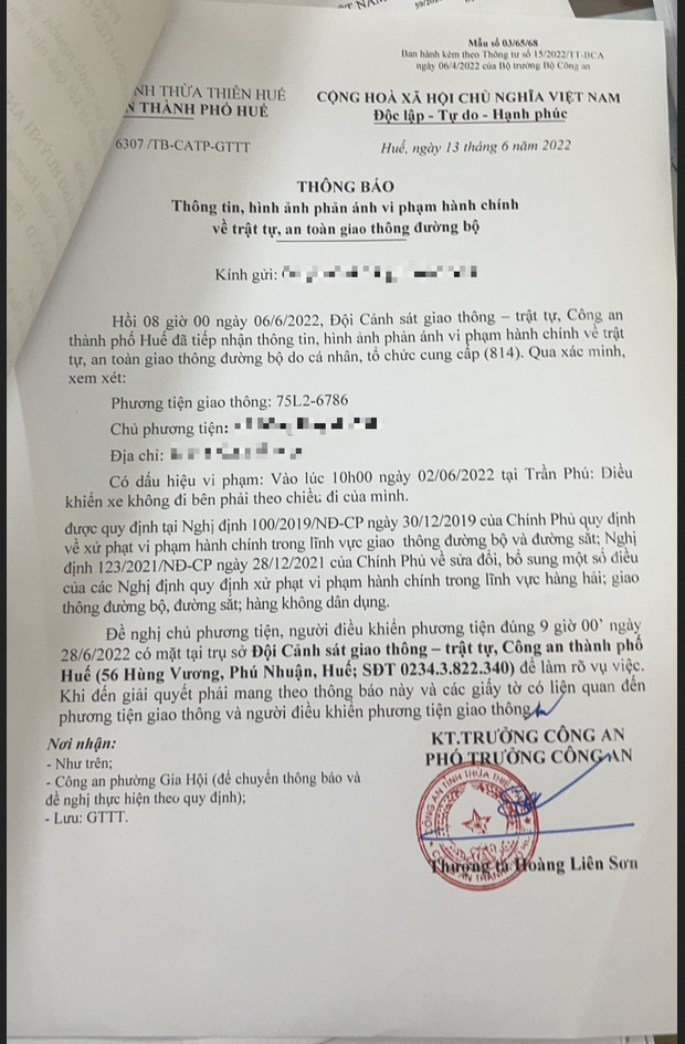 Vào lúc 10 giờ 00 phút ngày 02/06/2022 trên tuyến đường Trần Phú, xe mô tô mang biển kiểm soát 75L26786, điều khiển xe không đi bên phải theo chiều đi của mình.