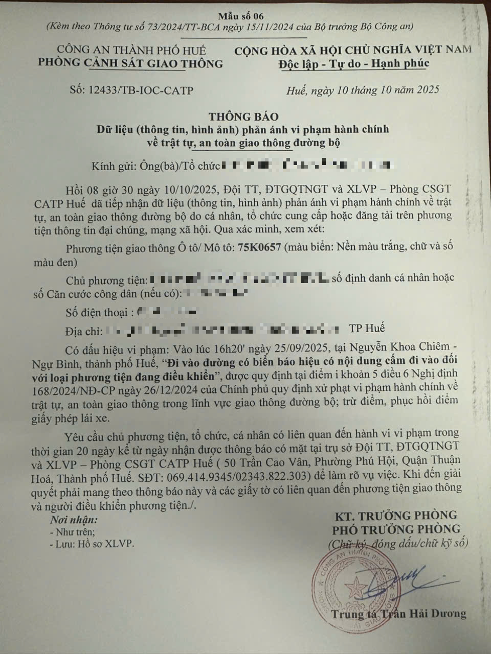 Vấn đề Ông/Bà phản ánh, Công an thành phố Huế đã chỉ đạo Phòng Cảnh sát giao thông kiểm tra và xin thông báo kết quả như sau: