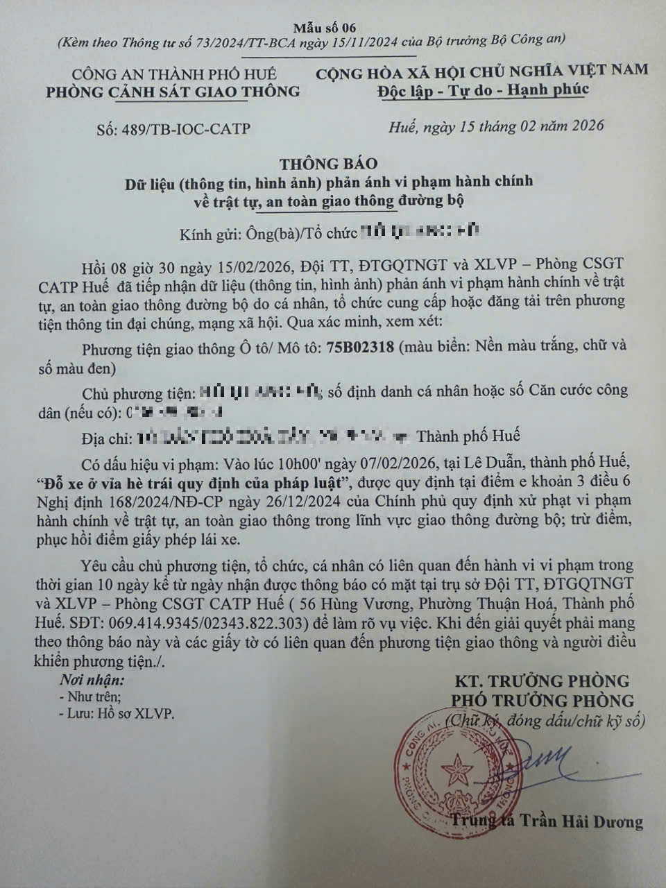 Qua hình ảnh phản ánh, Phòng Cảnh sát giao thông xác định lỗi vi phạm của người điều khiển phương tiện 75B02318 như sau: “Đỗ xe ở vỉa hè trái quy định của pháp luật”, quy định tại điểm e, khoản 3, điều 6 Nghị định 168/2024/NĐ-CP.