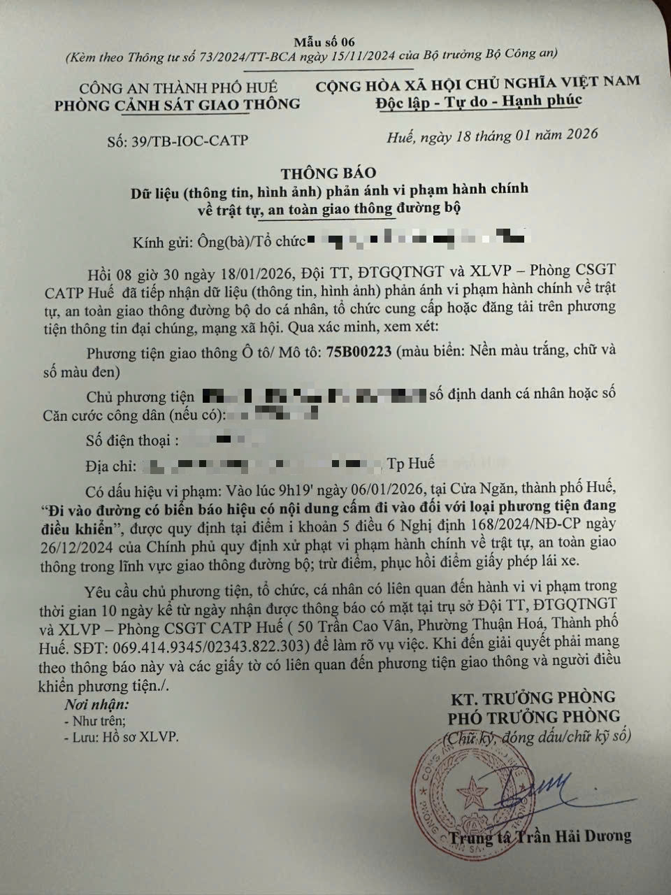 Qua hình ảnh phản ánh, Phòng Cảnh sát giao thông xác định lỗi vi phạm của người điều khiển phương tiện 75B00223 như sau: Đi vào đường có biển báo hiệu có nội dung cấm đi vào đối với loại phương tiện đang điều khiển, được quy định tại Điểm i khoản 5 Điều 6 Nghị định số 168/2024/NĐ-CP ngày 26/12/2024 của Chính phủ.