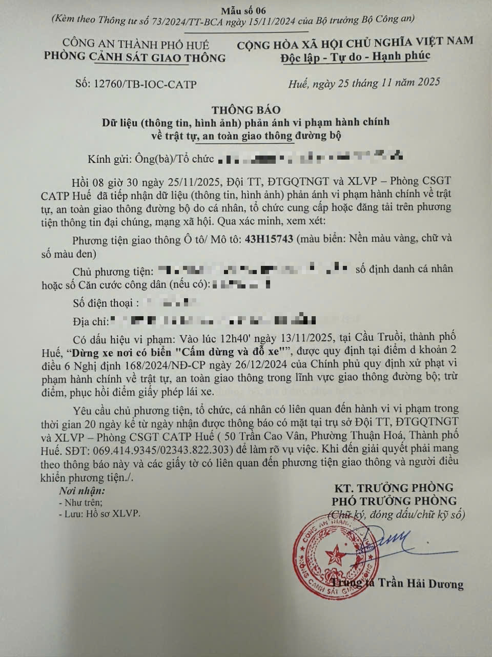 Qua hình ảnh phản ánh, Phòng Cảnh sát giao thông xác định lỗi vi phạm của người điều khiển phương tiện 43H15743 như sau: Dừng xe nơi có biển "Cấm dừng và đỗ xe" quy định tại điểm d, khoản 2, điều 6 Nghị định 168/2024/NĐ-CP.