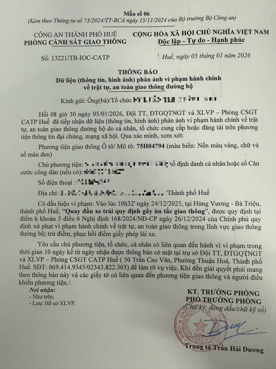 Qua hình ảnh phản ánh, Phòng Cảnh sát giao thông xác định lỗi vi phạm của người điều khiển phương tiện 75H04794 như sau: Quay đầu xe trái quy định gây ùn tắc giao thông, quy định tại điểm k, khoản 5, điều 6 Nghị định 168/2024/NĐ-CP.