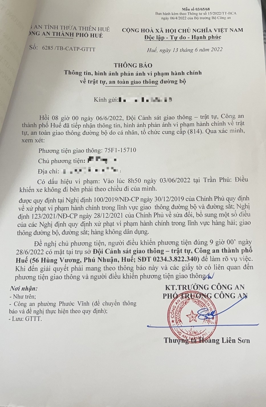 Công an thành phố đã lập hồ sơ, thông báo chủ phương tiện đến làm việc vào ngày 28/6/2022. Tuy nhiên, hiện chủ phương tiện vẫn chưa trình diện tại cơ quan. Công an thành phố Huế sẽ tiếp tục thông báo lực lượng tuần tra trên địa bàn, trong quá trình làm nhiệm vụ phát hiện, xử lý.
