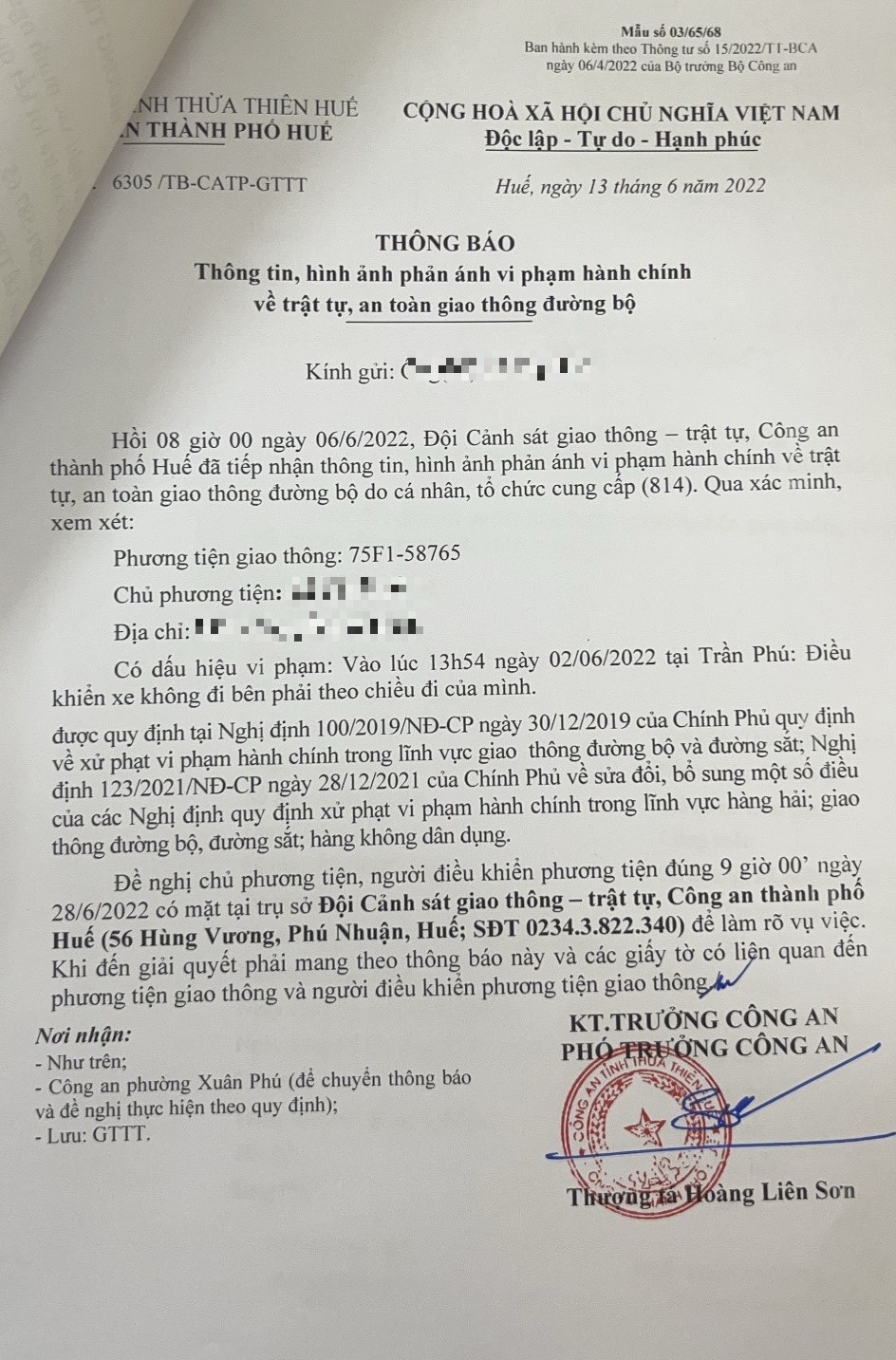 Công an thành phố đã lập hồ sơ, thông báo chủ phương tiện đến làm việc vào ngày 28/6/2022. Tuy nhiên, hiện chủ phương tiện vẫn chưa trình diện tại cơ quan. Công an thành phố Huế sẽ tiếp tục thông báo lực lượng tuần tra trên địa bàn, trong quá trình làm nhiệm vụ phát hiện, xử lý.