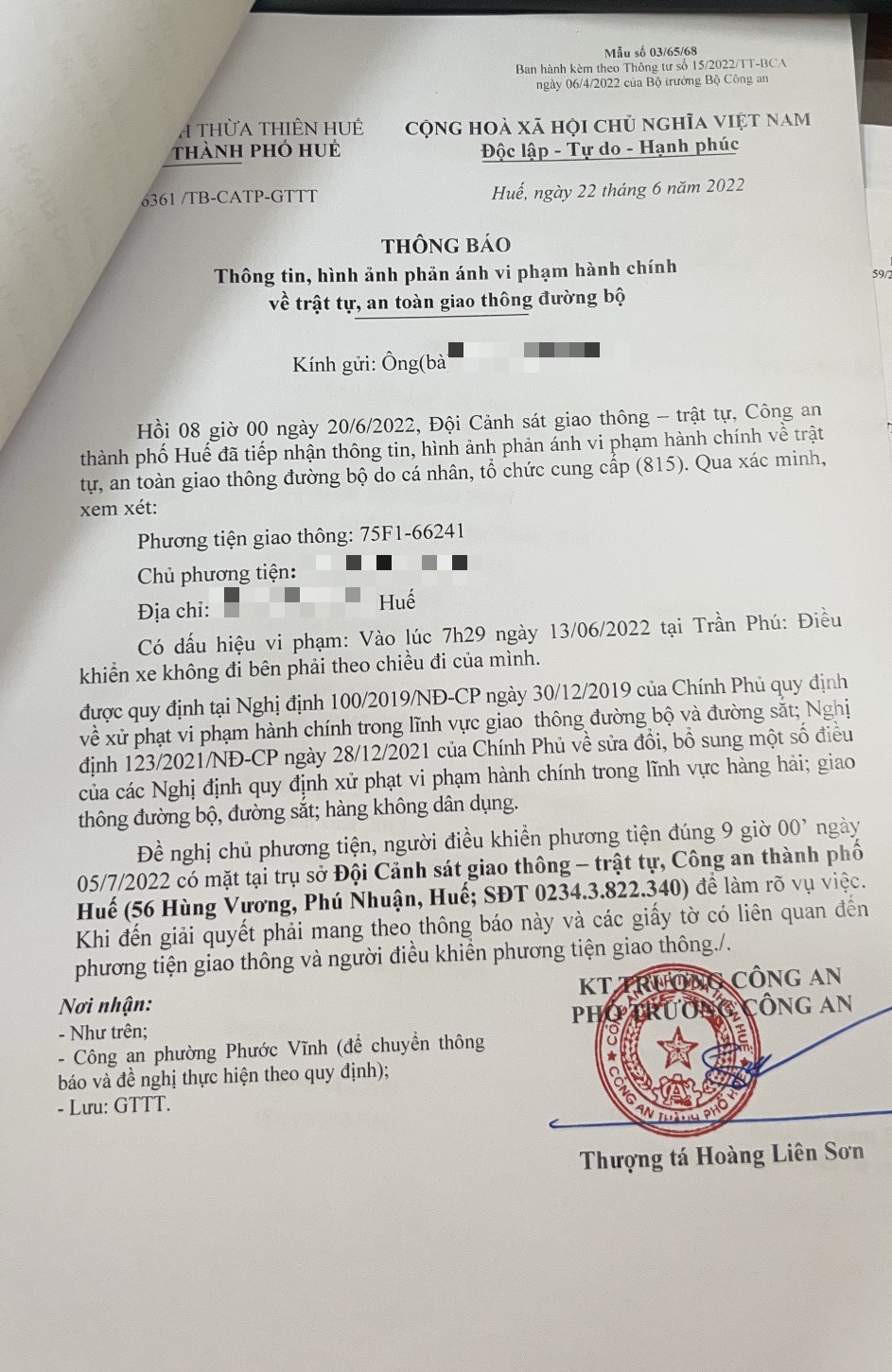 Công an thành phố đã lập hồ sơ, thông báo chủ phương tiện đến làm việc vào ngày 05/7/2022. Tuy nhiên, hiện chủ phương tiện vẫn chưa trình diện tại cơ quan. Công an thành phố Huế sẽ tiếp tục thông báo lực lượng tuần tra trên địa bàn, trong quá trình làm nhiệm vụ phát hiện, xử lý.