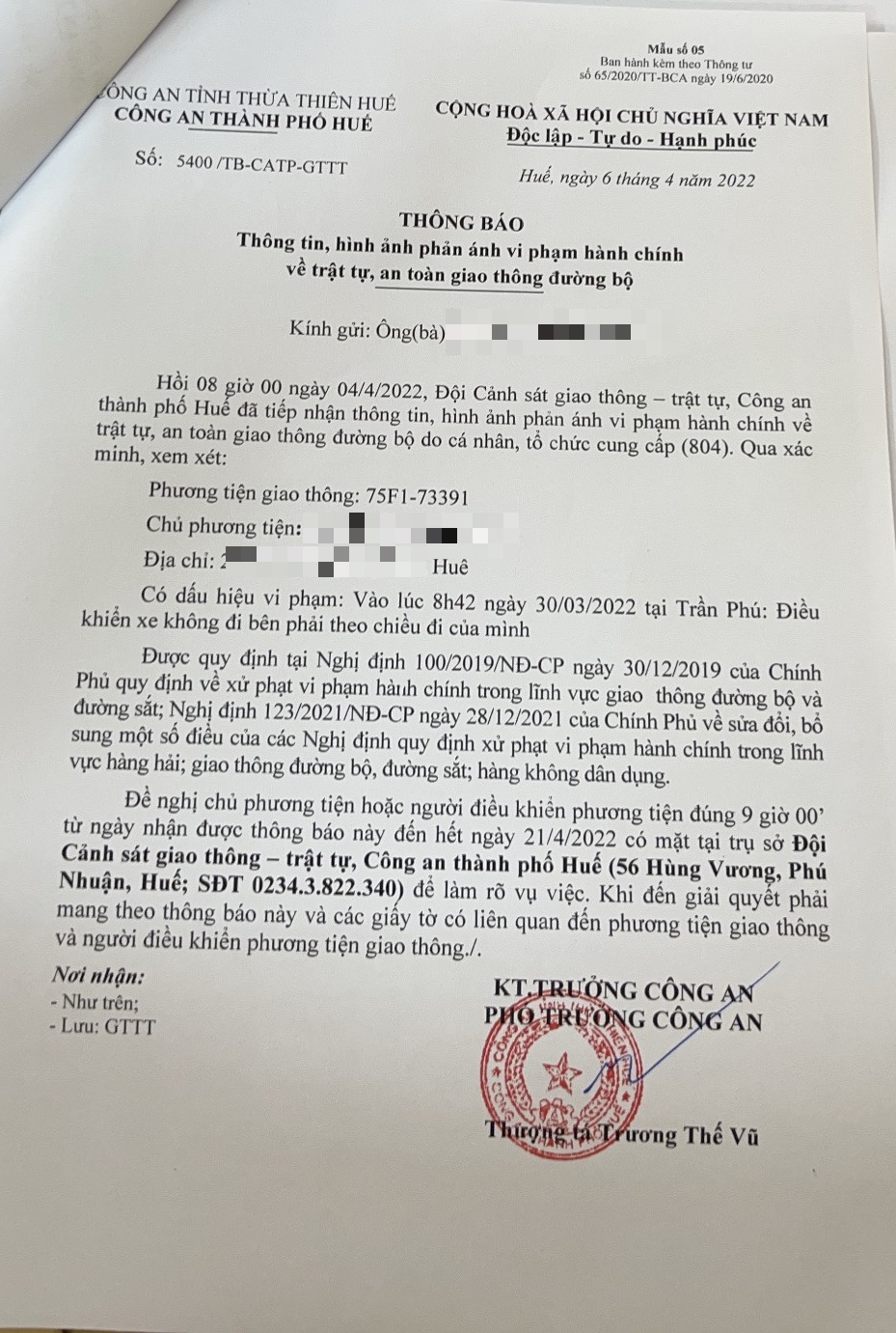 Công an thành phố đã lập hồ sơ, thông báo chủ phương tiện đến làm việc vào ngày 21/4/2022. Tuy nhiên, hiện chủ phương tiện vẫn chưa trình diện tại cơ quan. Công an thành phố Huế sẽ tiếp tục thông báo lực lượng tuần tra trên địa bàn, trong quá trình làm nhiệm vụ phát hiện, xử lý.