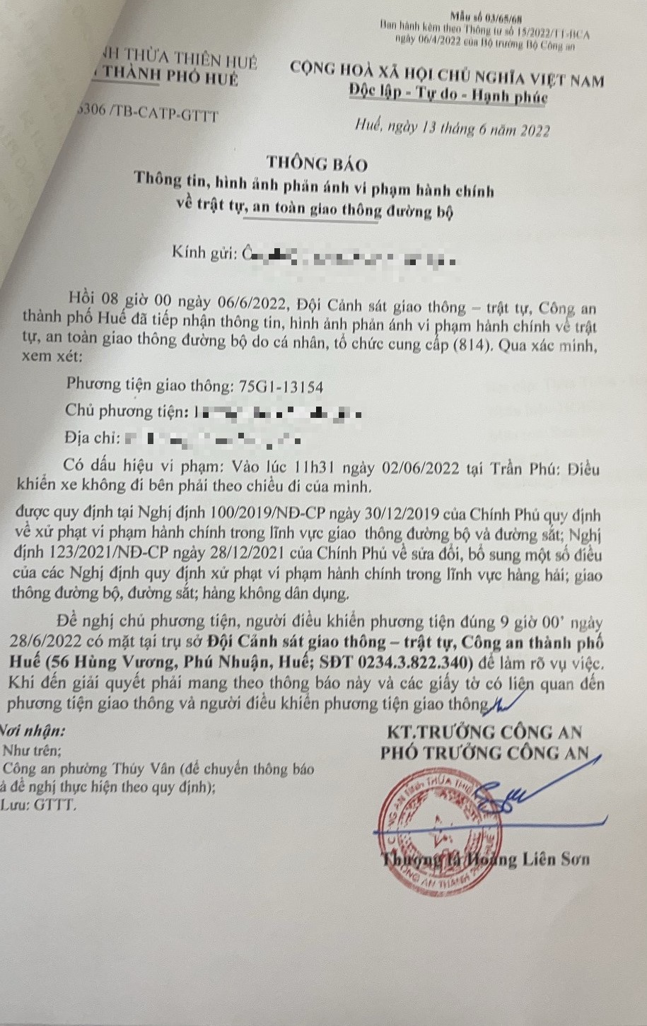 Công an thành phố đã lập hồ sơ, thông báo chủ phương tiện đến làm việc vào ngày 28/6/2022. Tuy nhiên, hiện chủ phương tiện vẫn chưa trình diện tại cơ quan. Công an thành phố Huế sẽ tiếp tục thông báo lực lượng tuần tra trên địa bàn, trong quá trình làm nhiệm vụ phát hiện, xử lý.