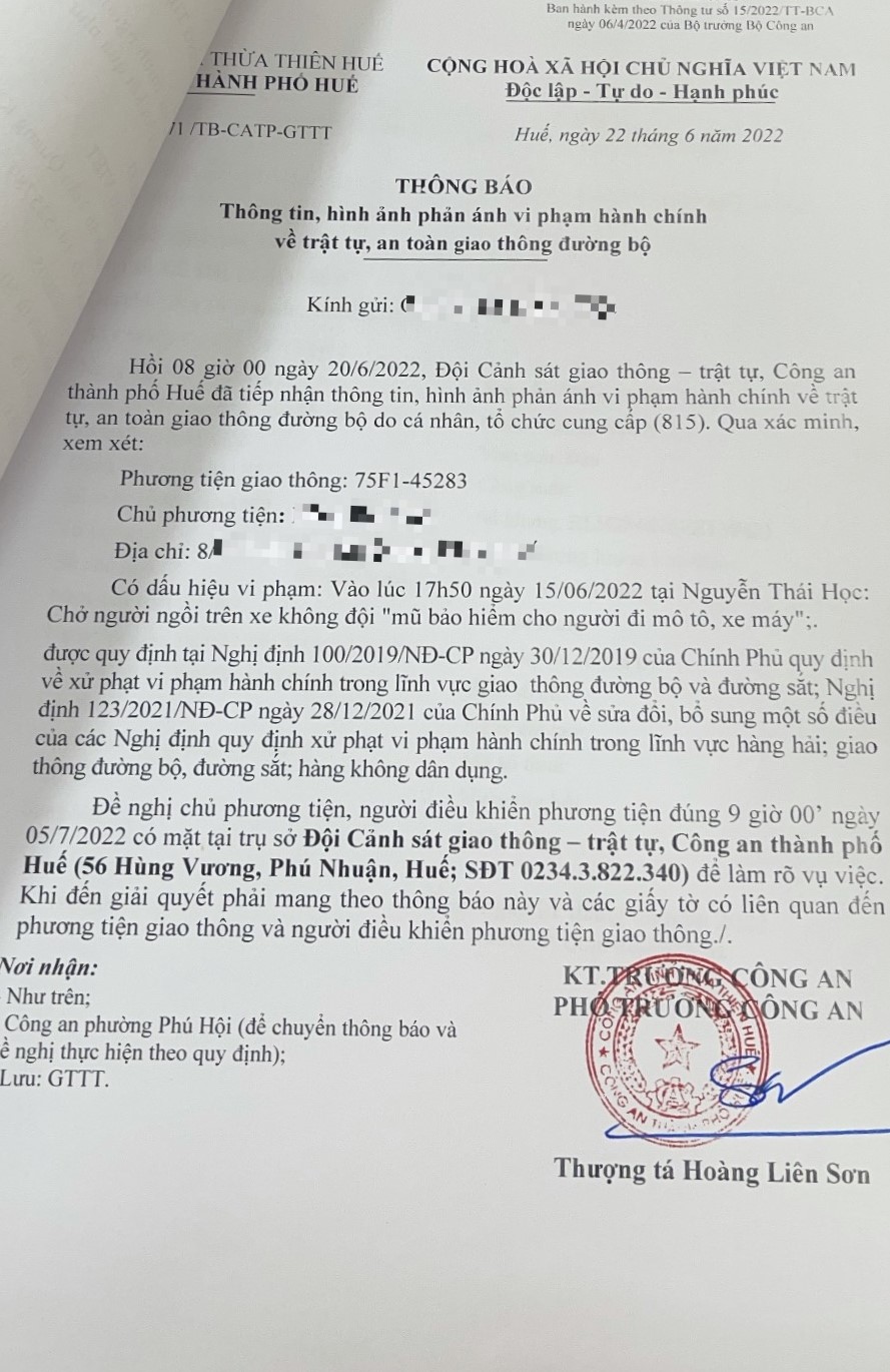Công an thành phố đã lập hồ sơ, thông báo chủ phương tiện đến làm việc vào ngày 28/6/2022. Tuy nhiên, hiện chủ phương tiện vẫn chưa trình diện tại cơ quan. Công an thành phố Huế sẽ tiếp tục thông báo lực lượng tuần tra trên địa bàn, trong quá trình làm nhiệm vụ phát hiện, xử lý.