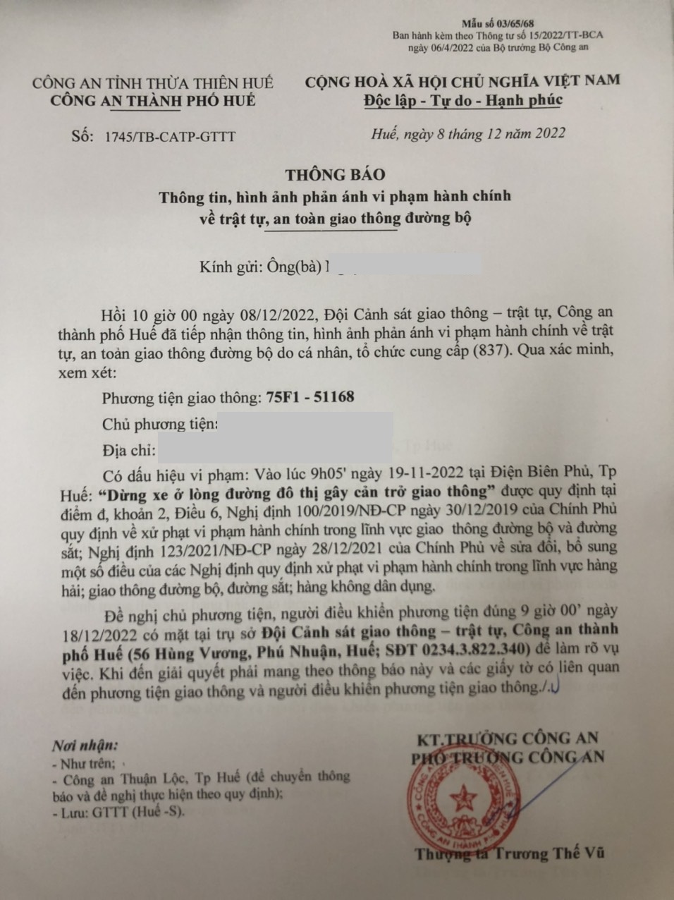 Công an TP Huế đã gửi thông báo, yêu cầu chủ phương tiện đến làm việc theo quy định. Tuy nhiên, hiện chủ phương tiện vẫn chưa trình diện tại cơ quan. Công an TP Huế sẽ tiếp tục thông báo các tổ tuần tra kiểm soát trên địa bàn, trong quá trình làm nhiệm vụ nếu phát hiện sẽ tiến hành dừng xe để xử lý.