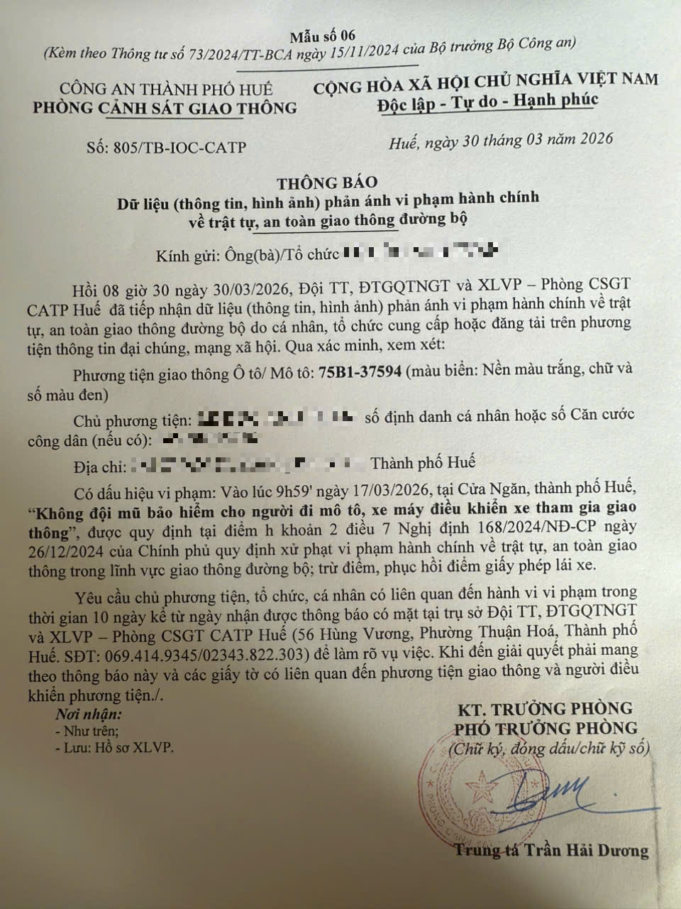 Qua hình ảnh phản ánh, Phòng Cảnh sát giao thông xác định lỗi vi phạm của người điều khiển phương tiện 75B37594 như sau: Không đội mũ bảo hiểm cho người đi mô tô, xe máy điều khiển xe tham gia giao thông, quy định tại điểm h khoản 2 điều 7 Nghị định 168/2024/NĐ-CP.