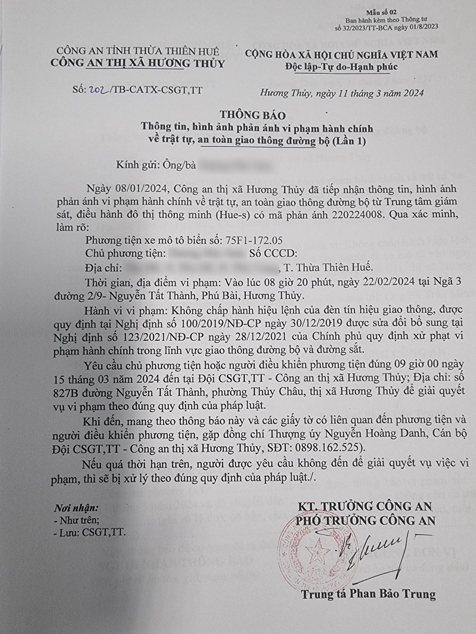 Công an thị xã Hương Thuỷ đã gửi thông báo, yêu cầu chủ phương tiện đến làm việc theo quy định. Tuy nhiên, hiện chủ phương tiện vẫn chưa trình diện tại cơ quan. Công an thị xã Hương Thuỷ sẽ tiếp tục thông báo Công an phường, xã nơi chủ phương tiện thường trú; đồng thời, thông báo các tổ tuần tra kiểm soát trên địa bàn, trong quá trình làm nhiệm vụ nếu phát hiện sẽ tiến hành dừng xe để xử lý.