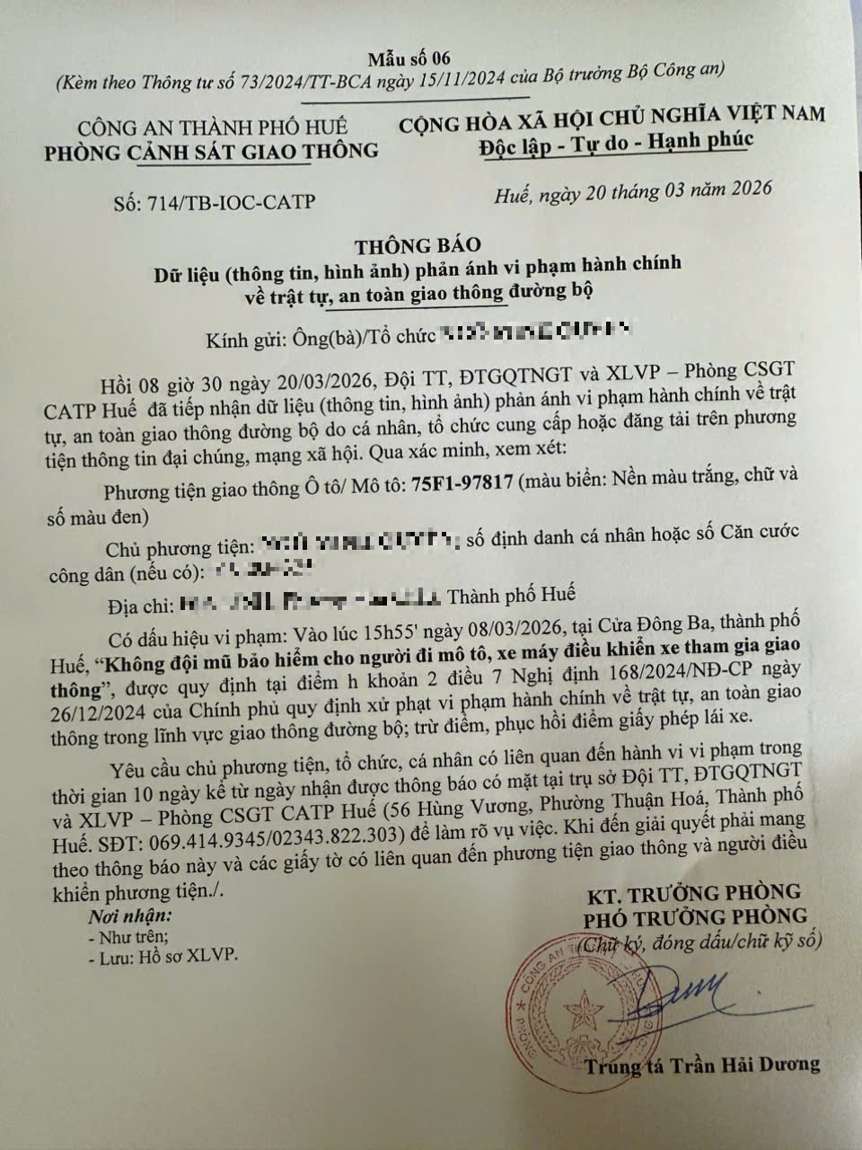 Qua hình ảnh phản ánh, người điều khiển phương tiện BKS 75F197817 có dấu hiệu vi phạm lỗi: Không đội mũ bảo hiểm cho người đi mô tô, xe máy điều khiển xe tham gia giao thông, quy định tại điểm h khoản 2 điều 7 Nghị định 168/2024/NĐ-CP.