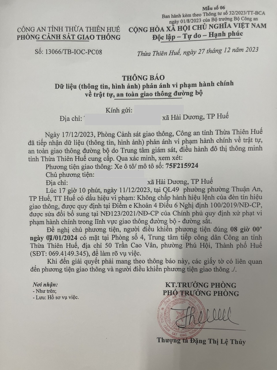 Công an thành phố đã lập hồ sơ, thông báo chủ phương tiện đến làm việc. Tuy nhiên, hiện chủ phương tiện vẫn chưa trình diện tại cơ quan. Công an thành phố Huế sẽ tiếp tục thông báo lực lượng tuần tra trên địa bàn, trong quá trình làm nhiệm vụ phát hiện, xử lý.