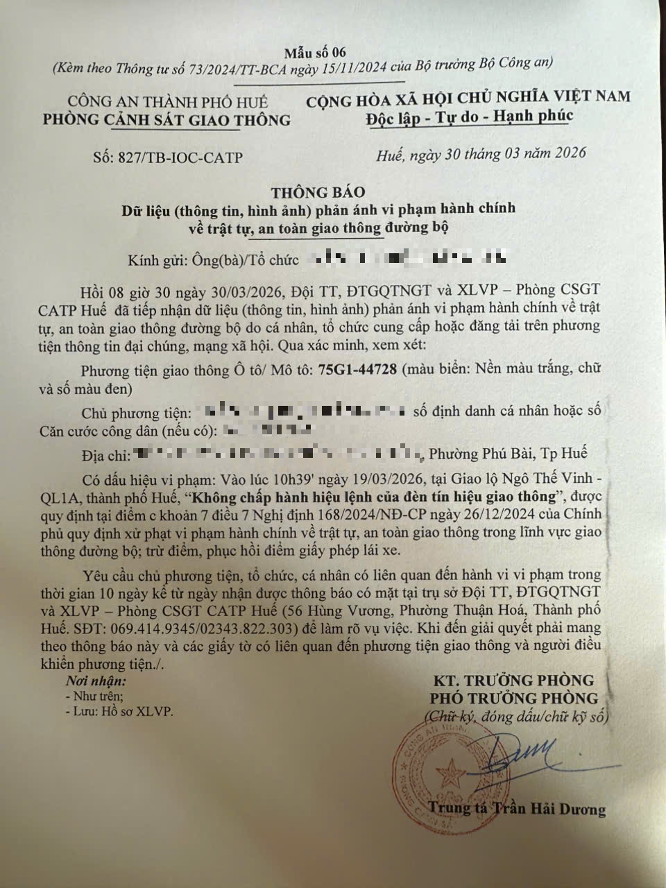 Qua hình ảnh phản ánh, Phòng Cảnh sát giao thông xác định lỗi vi phạm của người điều khiển phương tiện BKS 75G144728 như sau: Không chấp hành hiệu lệnh của đèn tín hiệu giao thông, quy định tại điểm c khoản 7 Điều 7 Nghị định 168/2024/NĐ-CP.