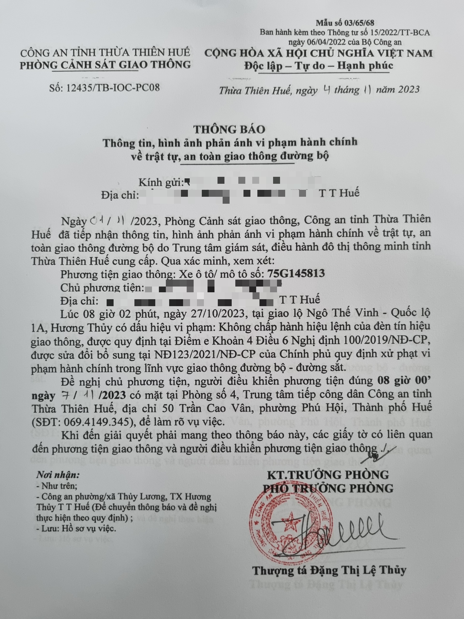 Phòng Cảnh sát giao thông đã gửi thông báo yêu cầu chủ phương tiện đến làm việc. Đồng thời, gửi thông báo đến Công an xã/ phường/ thị trấn (nơi thường trú của chủ phương tiện). Tuy nhiên, đến nay chủ phương tiện vẫn chưa đến làm việc theo yêu cầu. Phòng Cảnh sát giao thông sẽ tiếp tục thông báo cho lực lượng tuần tra kiểm soát trên đường phát hiện, xử lý.