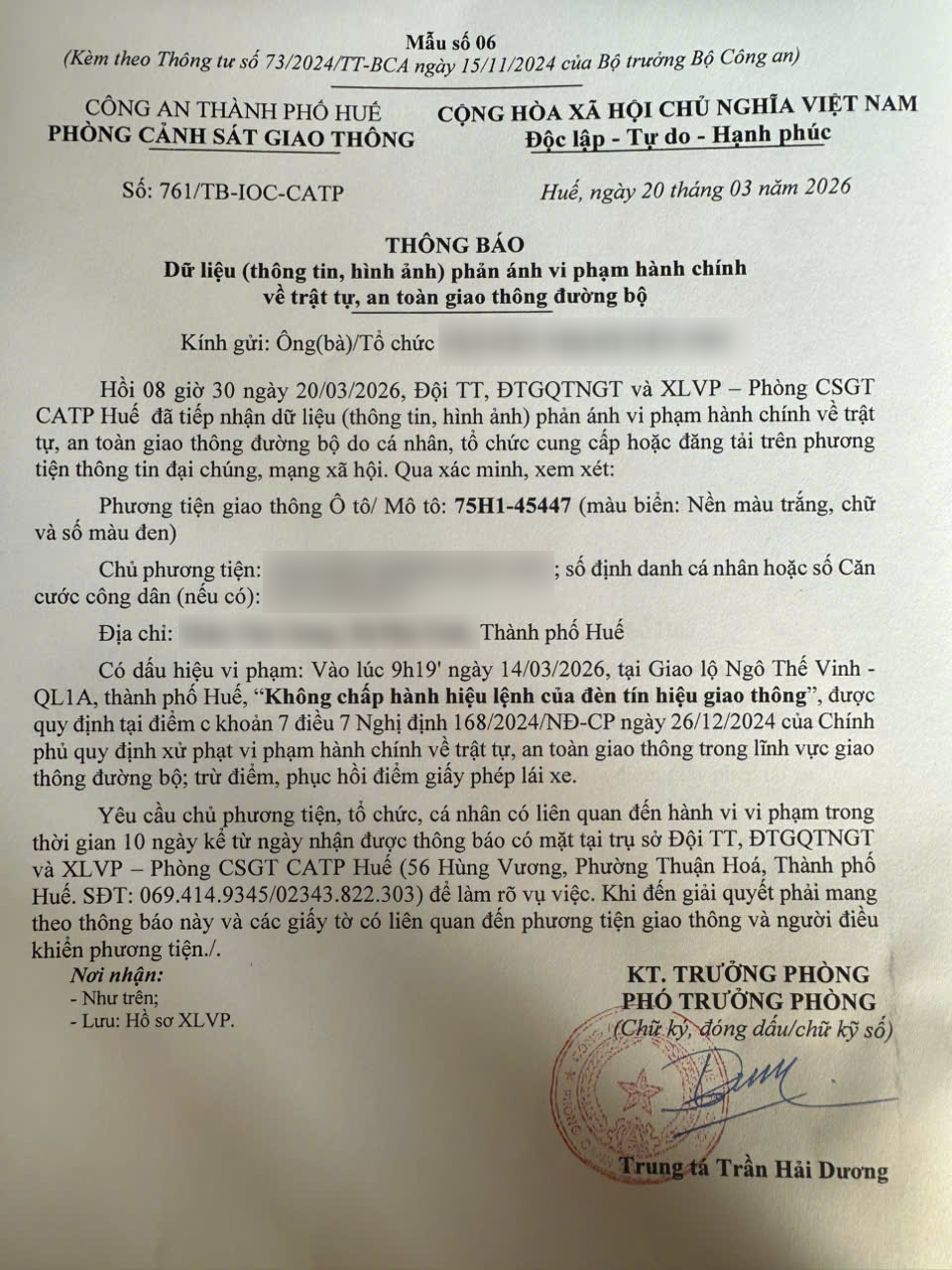 Qua hình ảnh phản ánh, Phòng Cảnh sát giao thông xác định lỗi vi phạm của người điều khiển phương tiện 75H145447 như sau: Không chấp hành hiệu lệnh của đèn tín hiệu giao thông, quy định tại điểm c khoản 7 điều 7 Nghị định 168/2024/NĐ-CP.