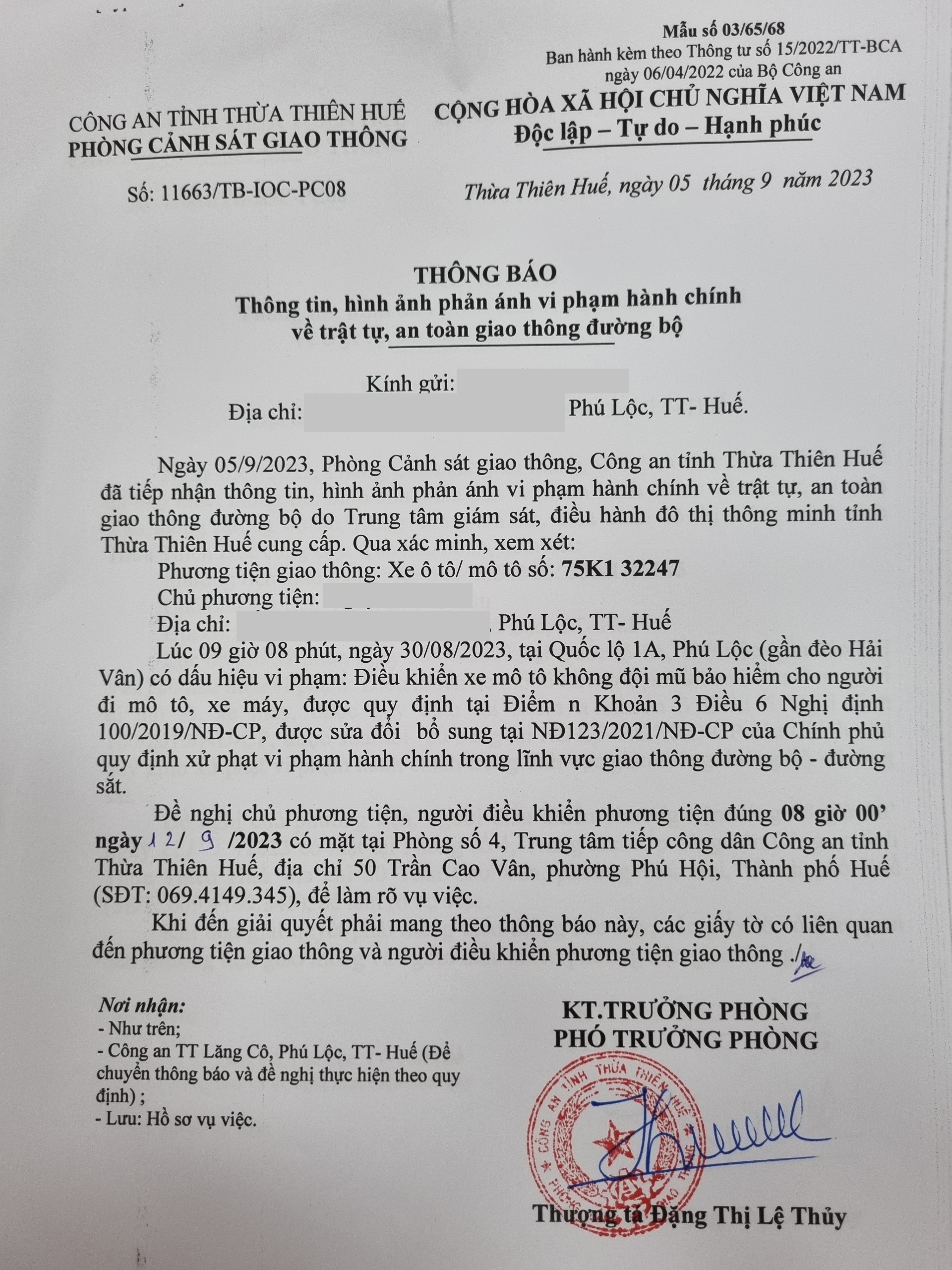 Phòng Cảnh sát giao thông đã gửi thông báo yêu cầu chủ phương tiện đến làm việc. Đồng thời, gửi thông báo đến Công an xã/phường/thị trấn (nơi thường trú của chủ phương tiện). Tuy nhiên, đến nay chủ phương tiện vẫn chưa đến làm việc theo yêu cầu. Phòng Cảnh sát giao thông sẽ tiếp tục thông báo cho lực lượng tuần tra kiểm soát trên đường phát hiện, xử lý.